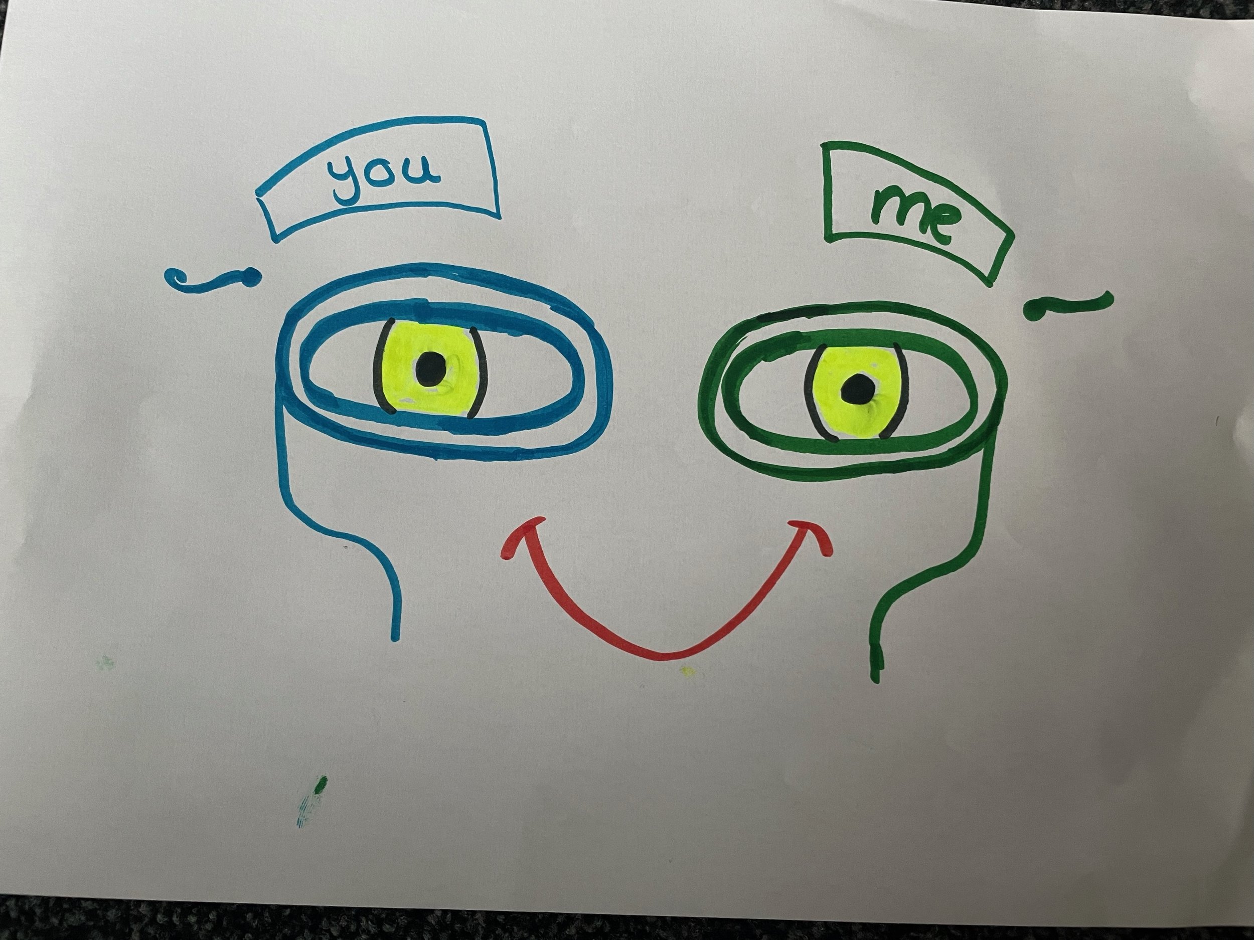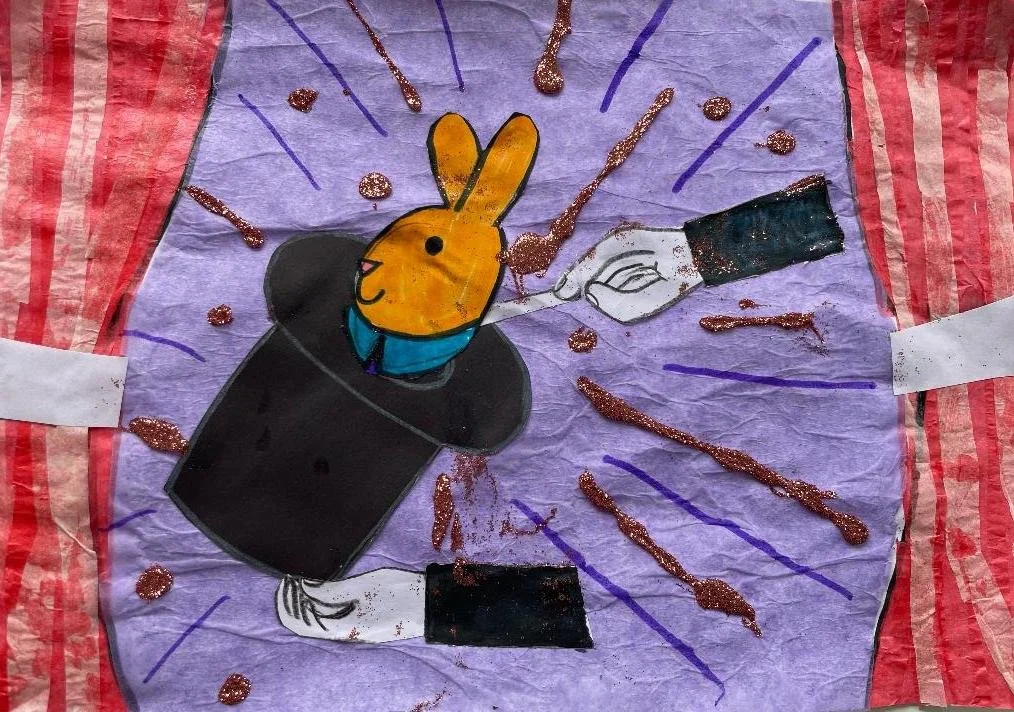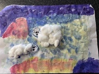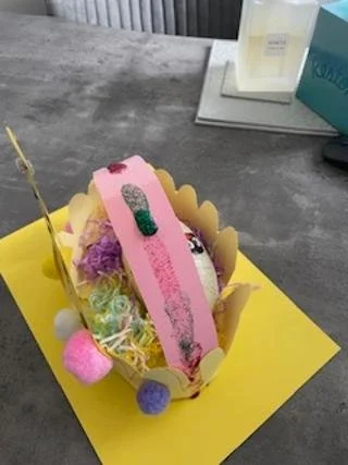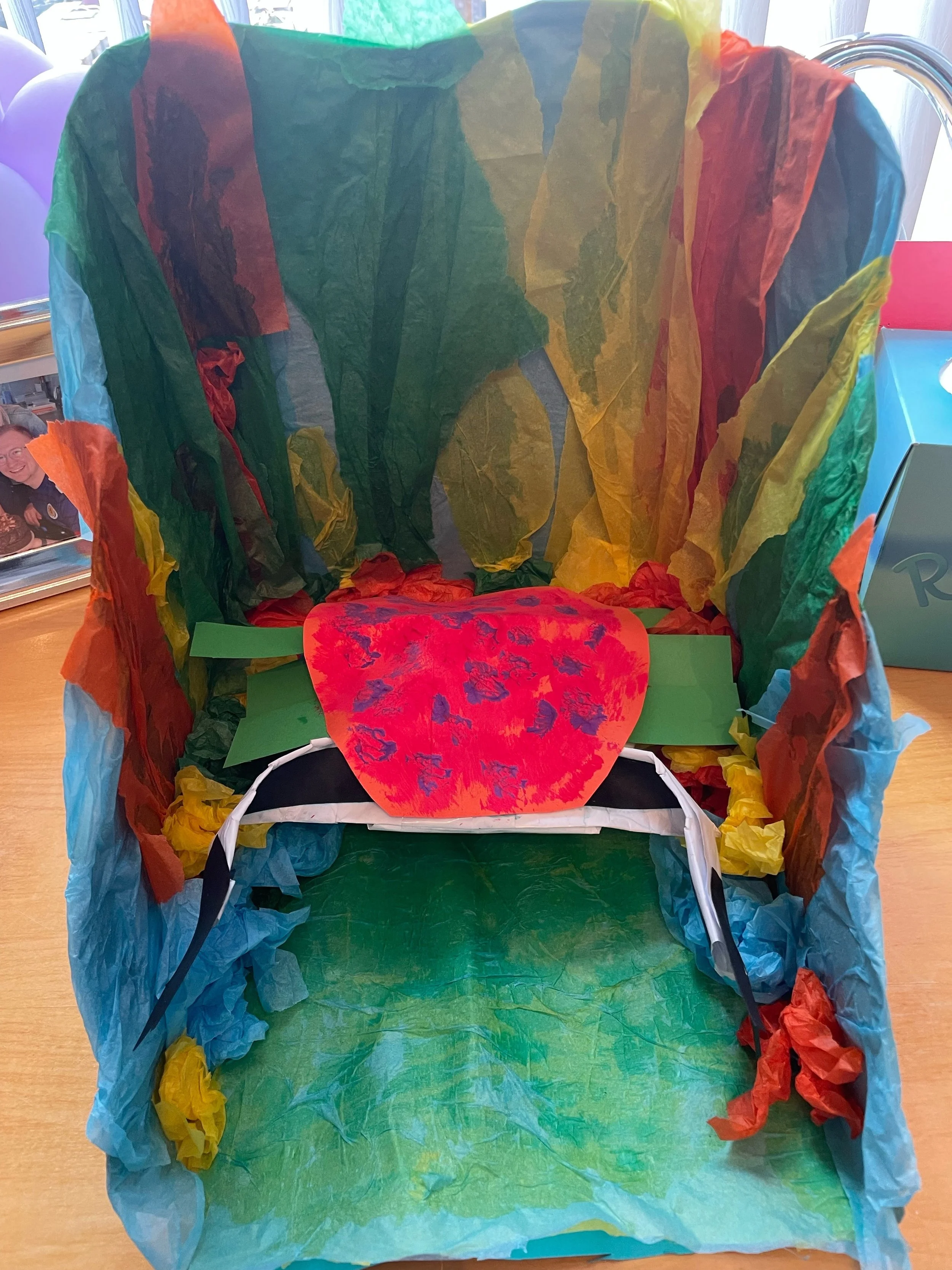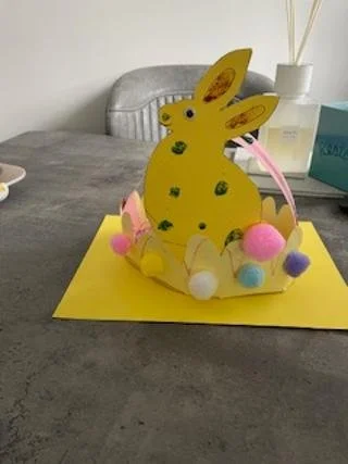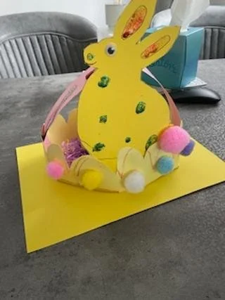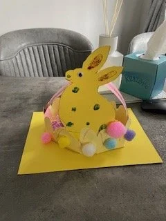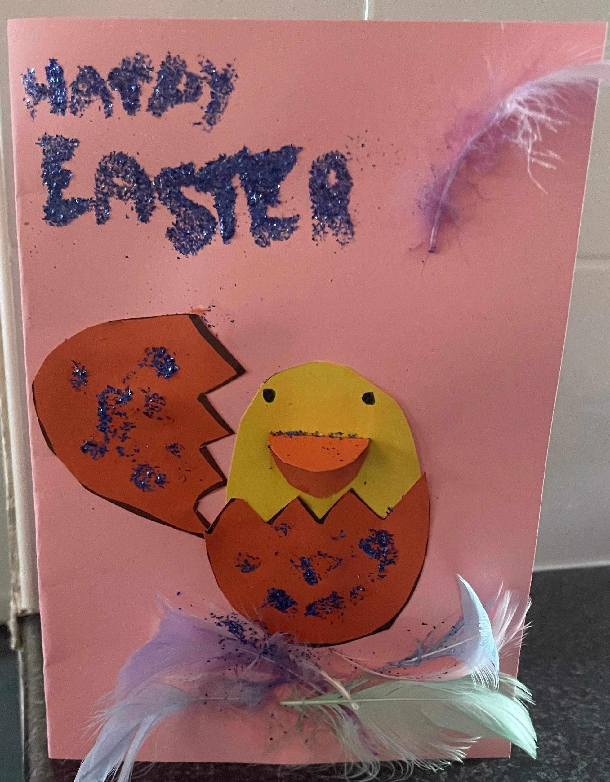 Helen made this fantastic Easter bunny holder on Easter Monday with support. Using card and glitter pens, straw, cotton wool, bobbly eyes, scissors and glue.