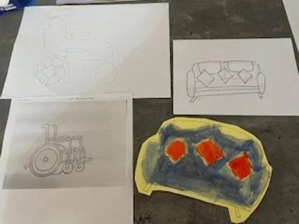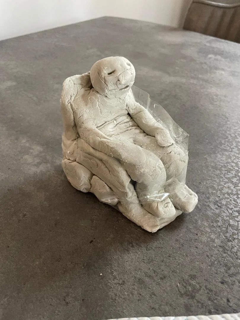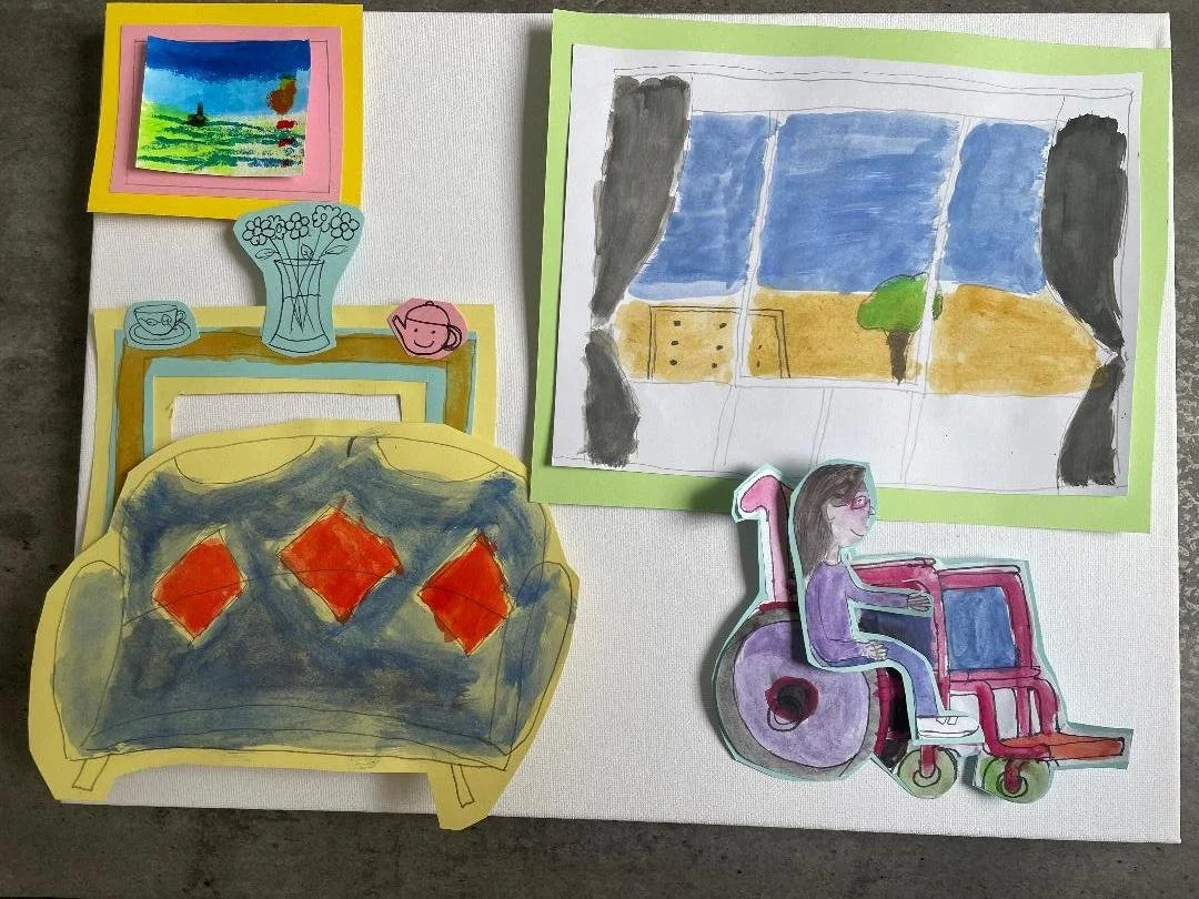 Clay modelling of Helen in her wheelchair, like Stella in her wheelchair in 'Mission to the Moon.'...
