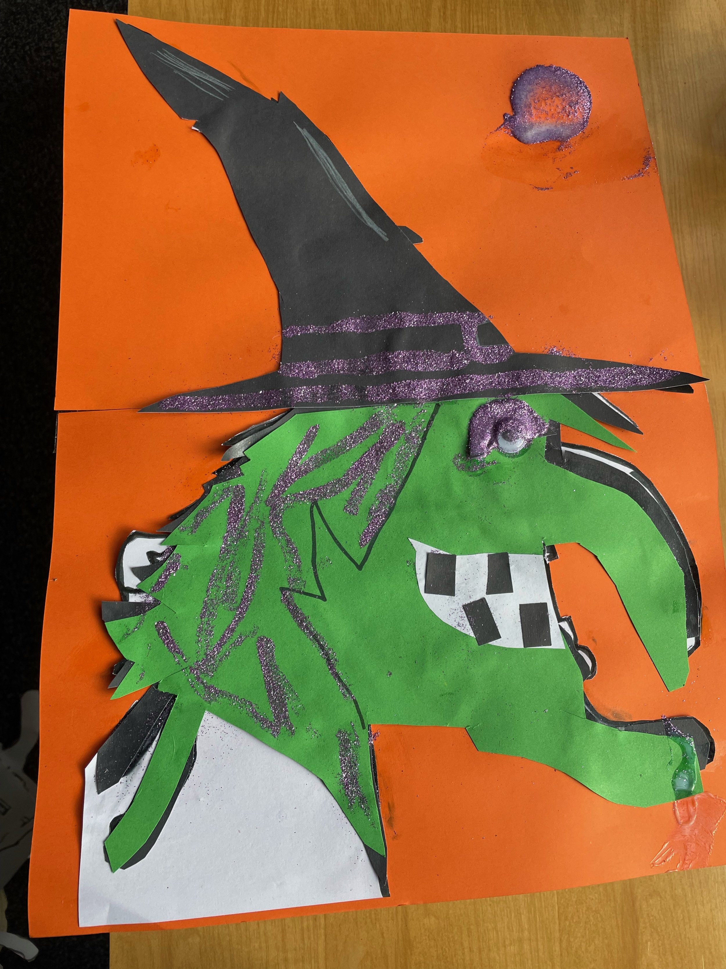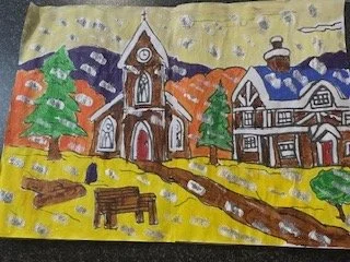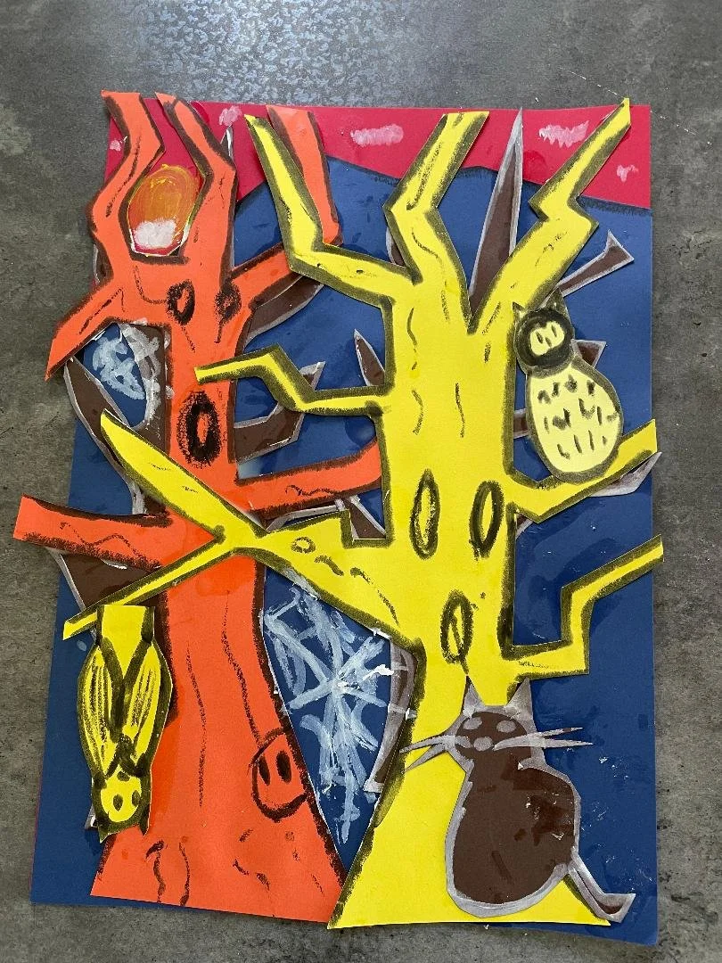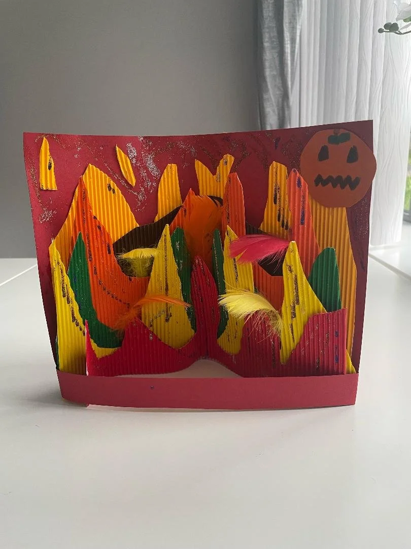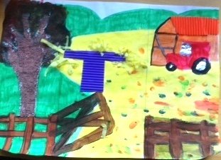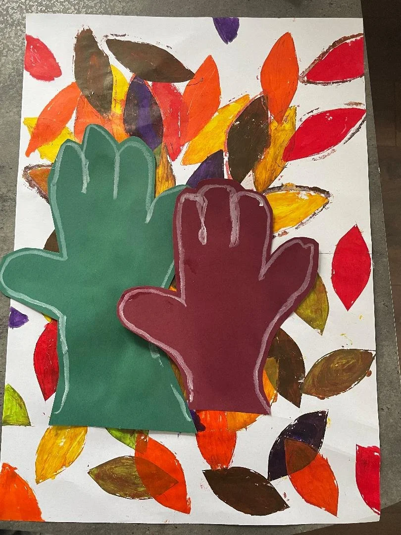 Helen started this glowing Autumn scene by using a leaf stencil and using paint sticks colouring inside the stencil with her support. The leaves are all randomly placed.