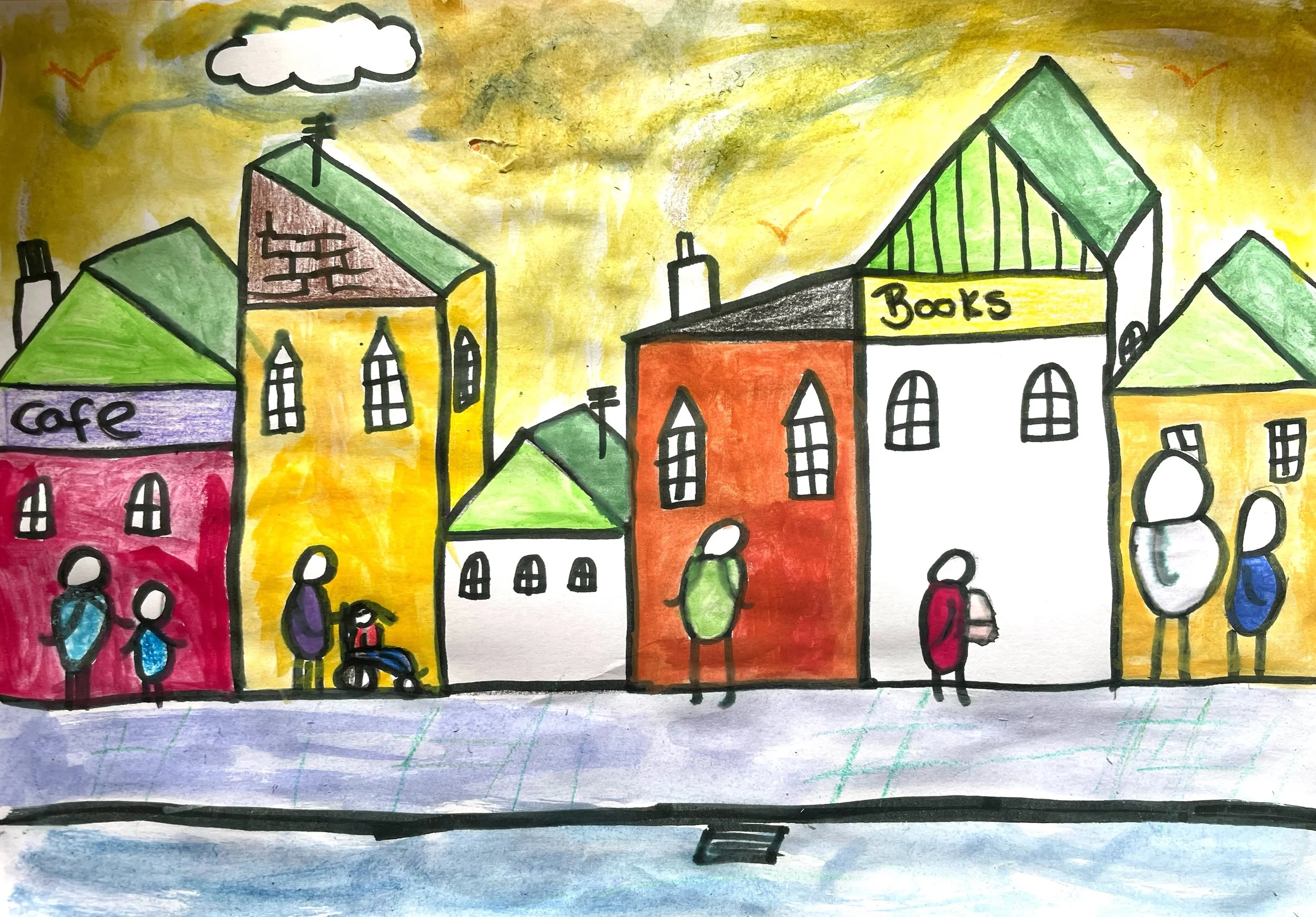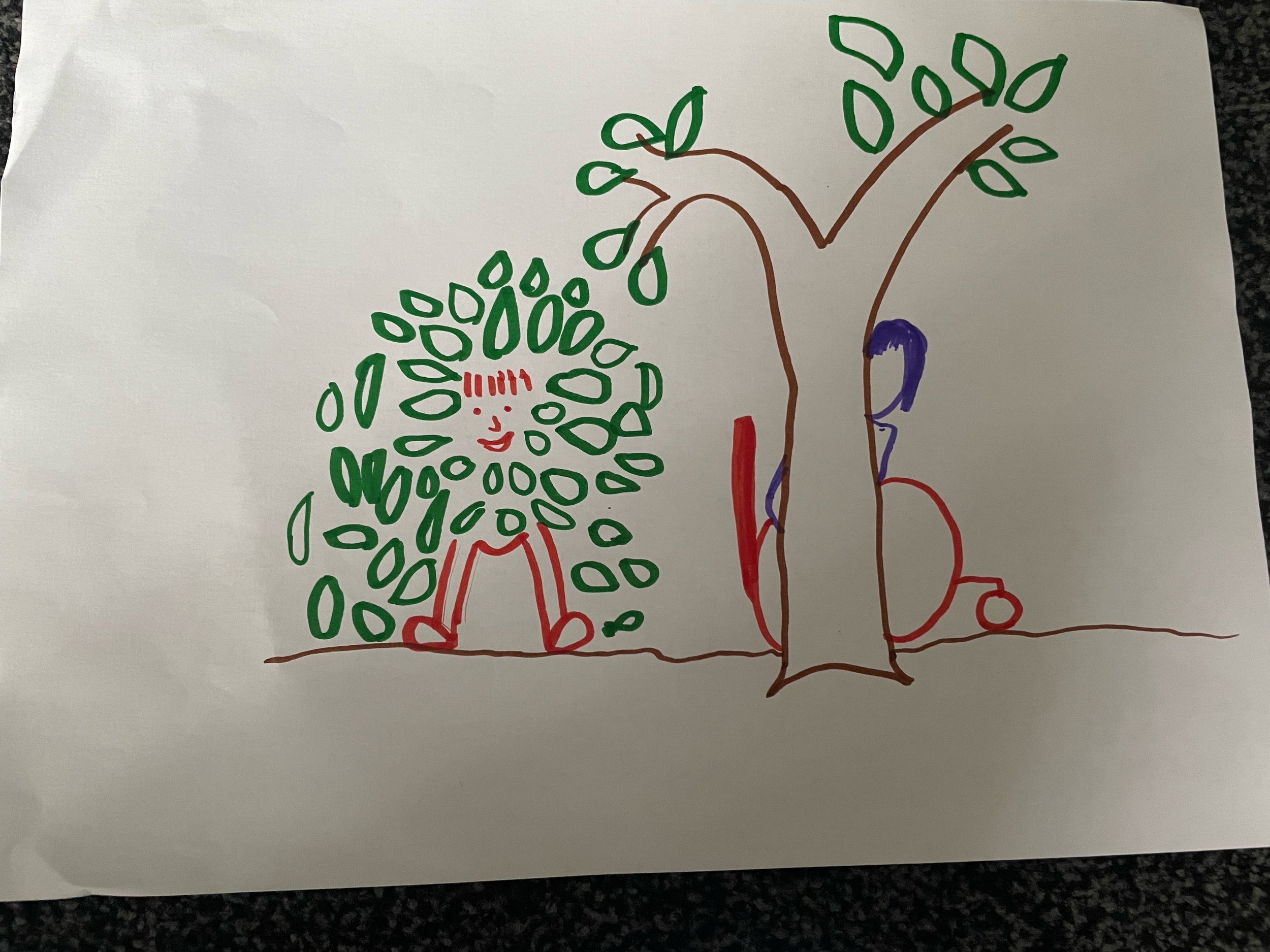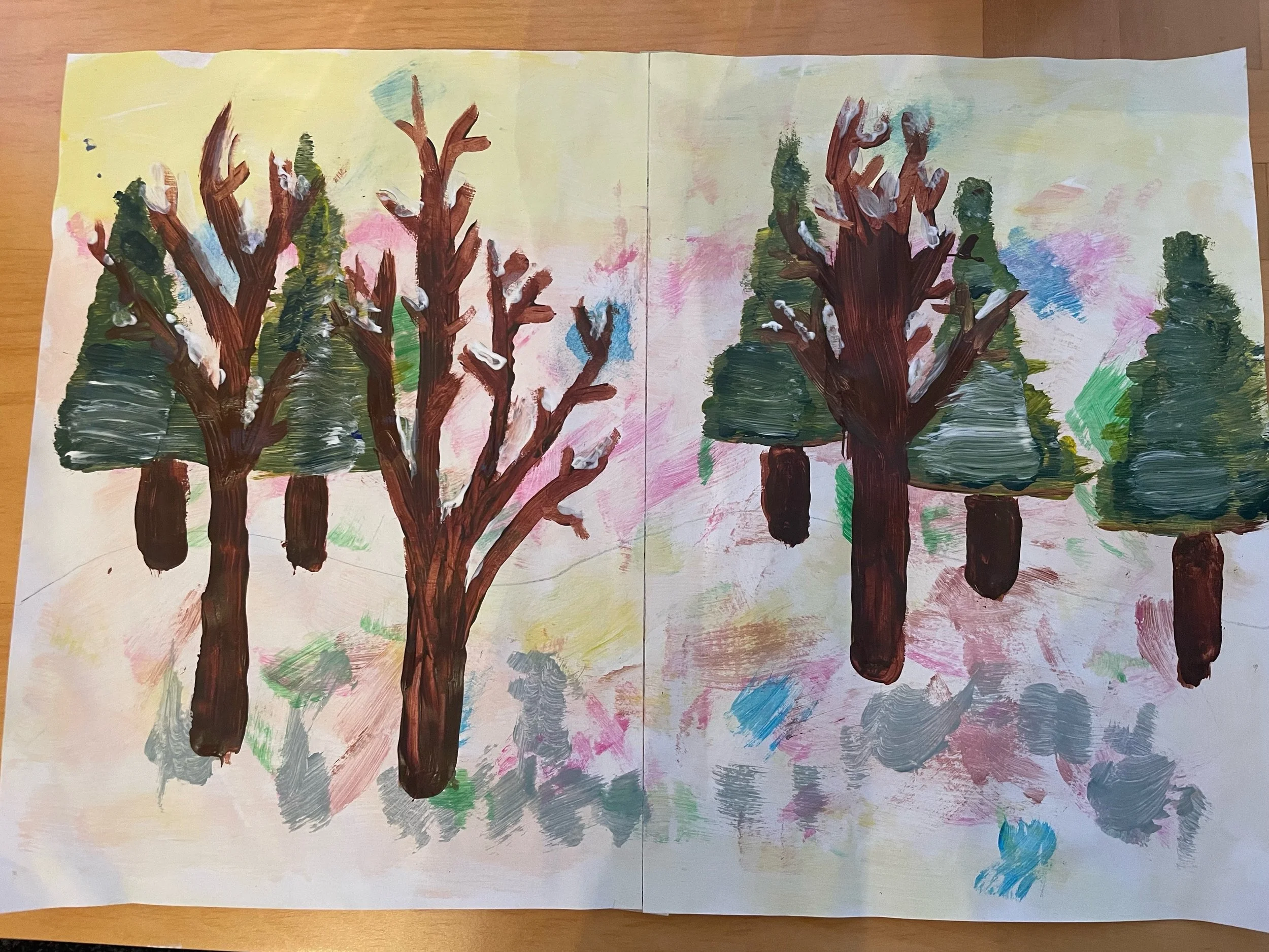 Helen started this glowing Autumn scene by using a leaf stencil and using paint sticks colouring inside the stencil with her support. The leaves are all randomly placed.