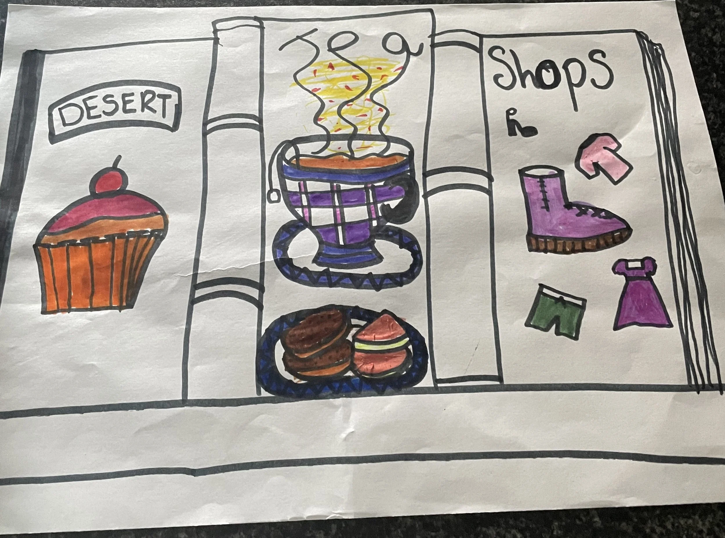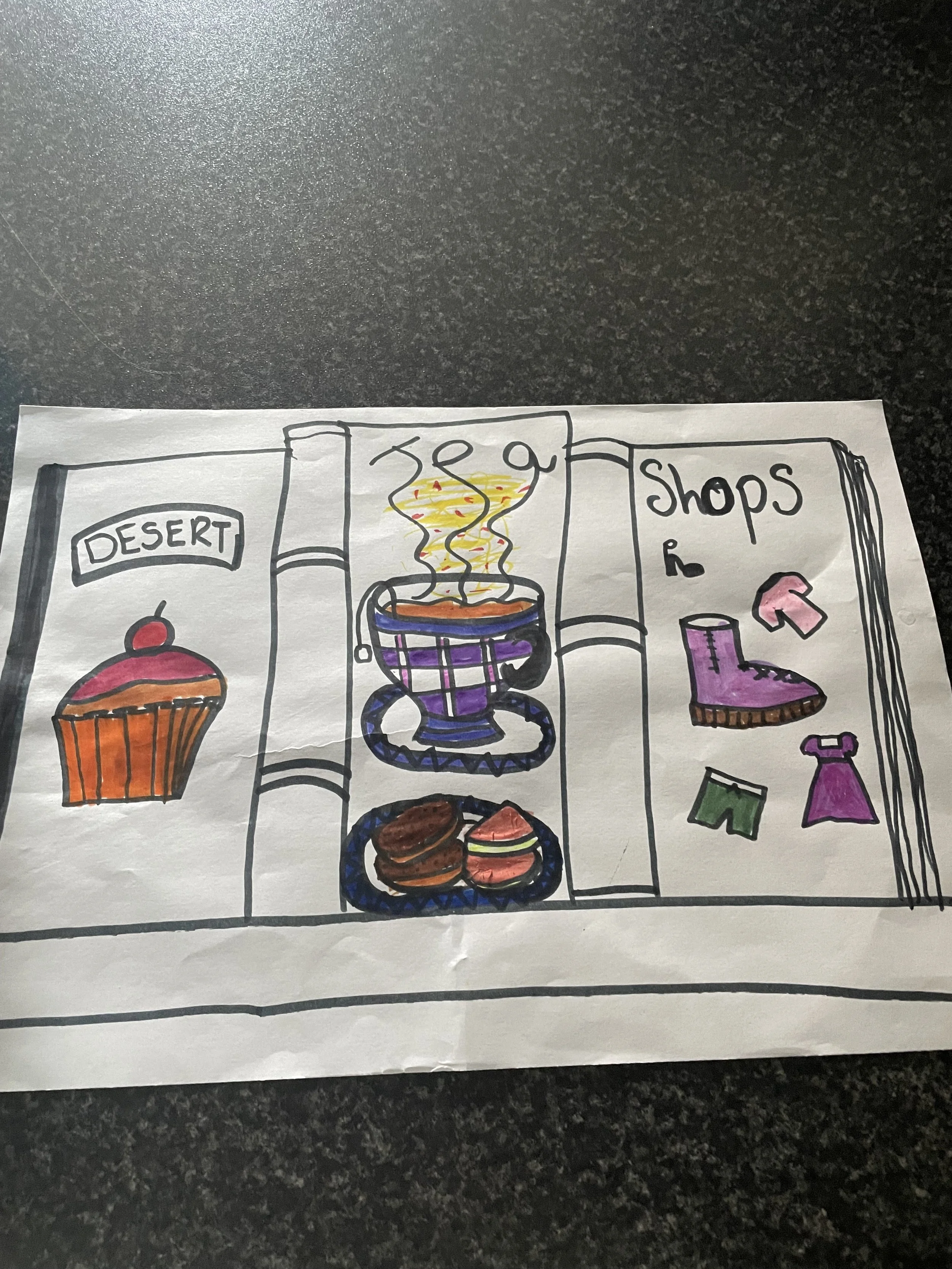 3rd illustration: Helen really enjoys going shopping for new clothes & enjoys picking her outfit each day & wearing her warm Boots & favourite jumpers.