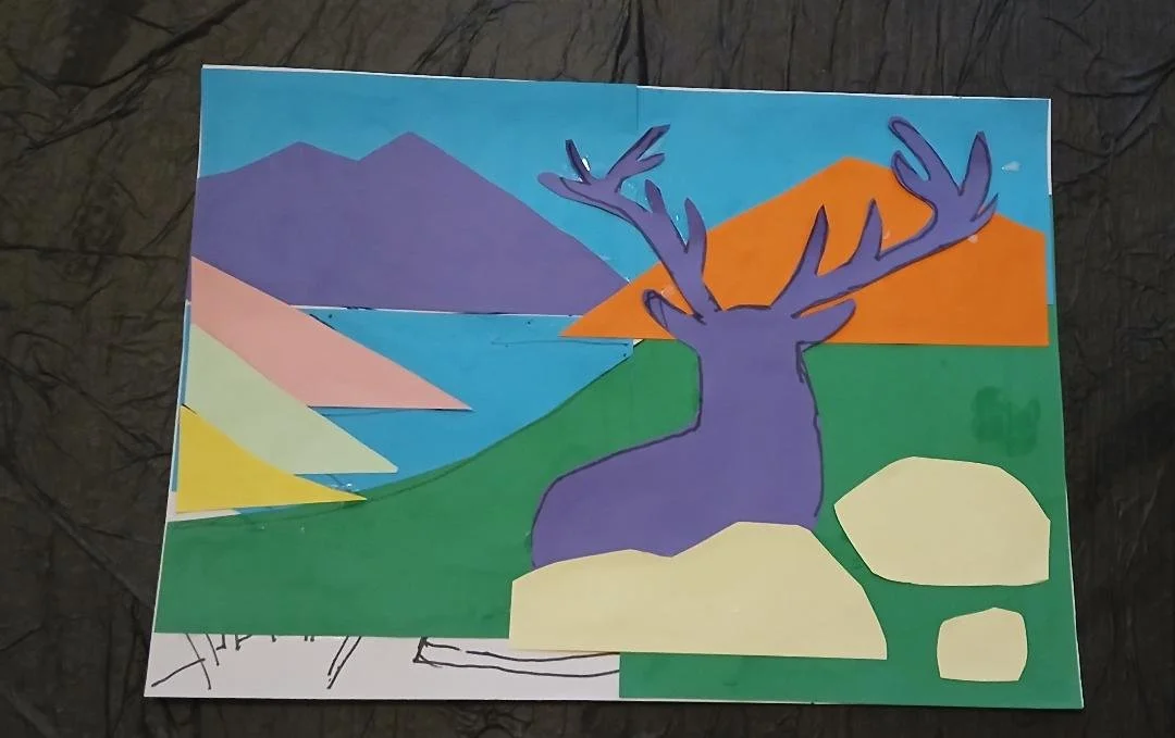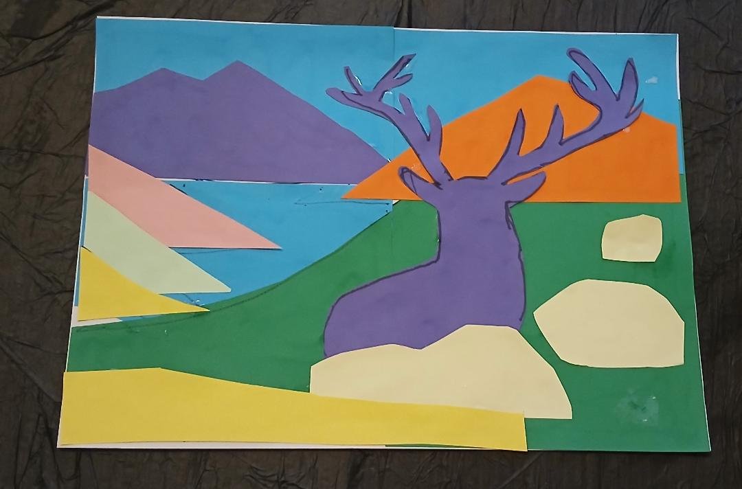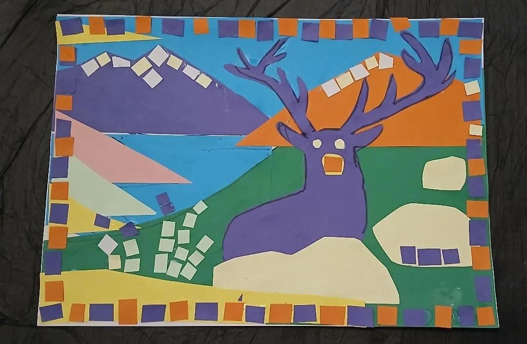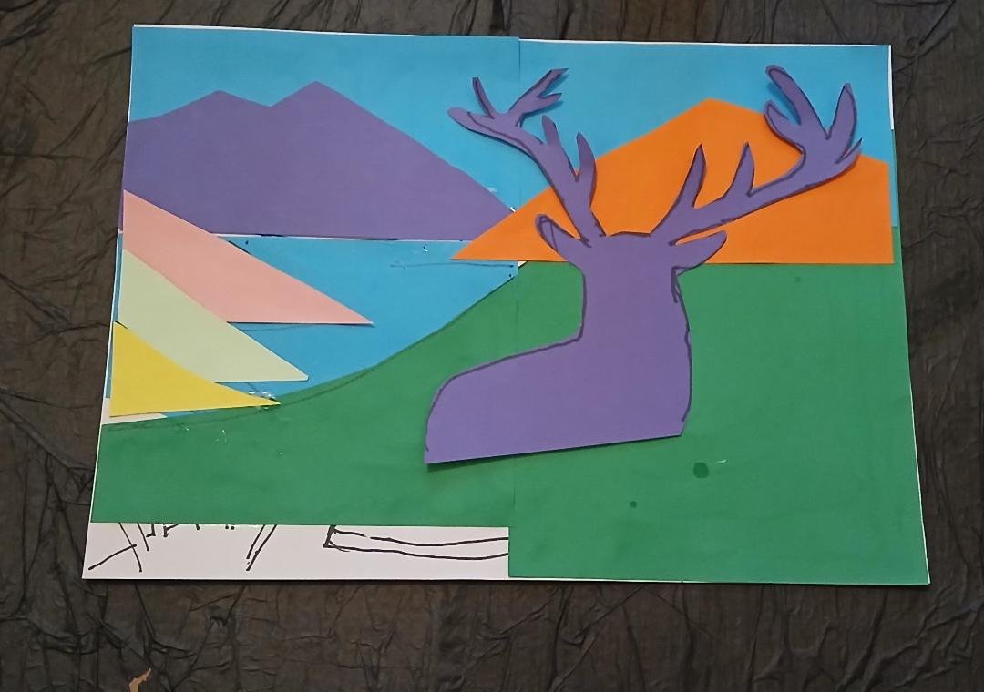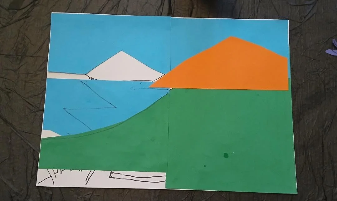 Step 2: Find colour card and choose which colour suits the shapes cut and cut the colour card. Assemble the colour shapes into this composition: