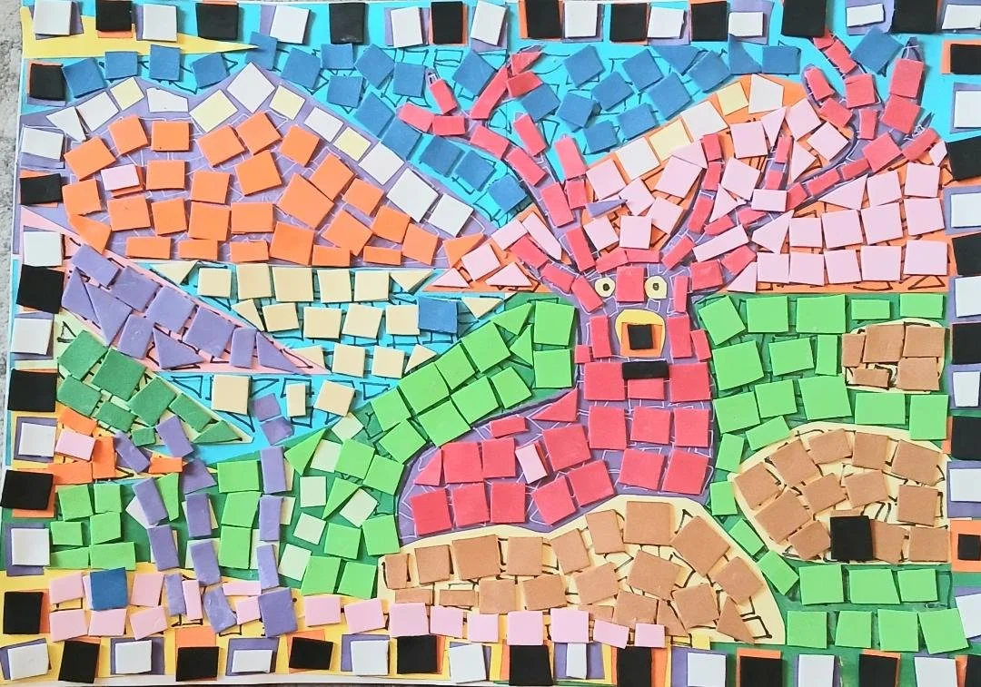 Draw on or place the mosaic pieces on the colour card. The pieces can be of different colours against the background colours for contrast: