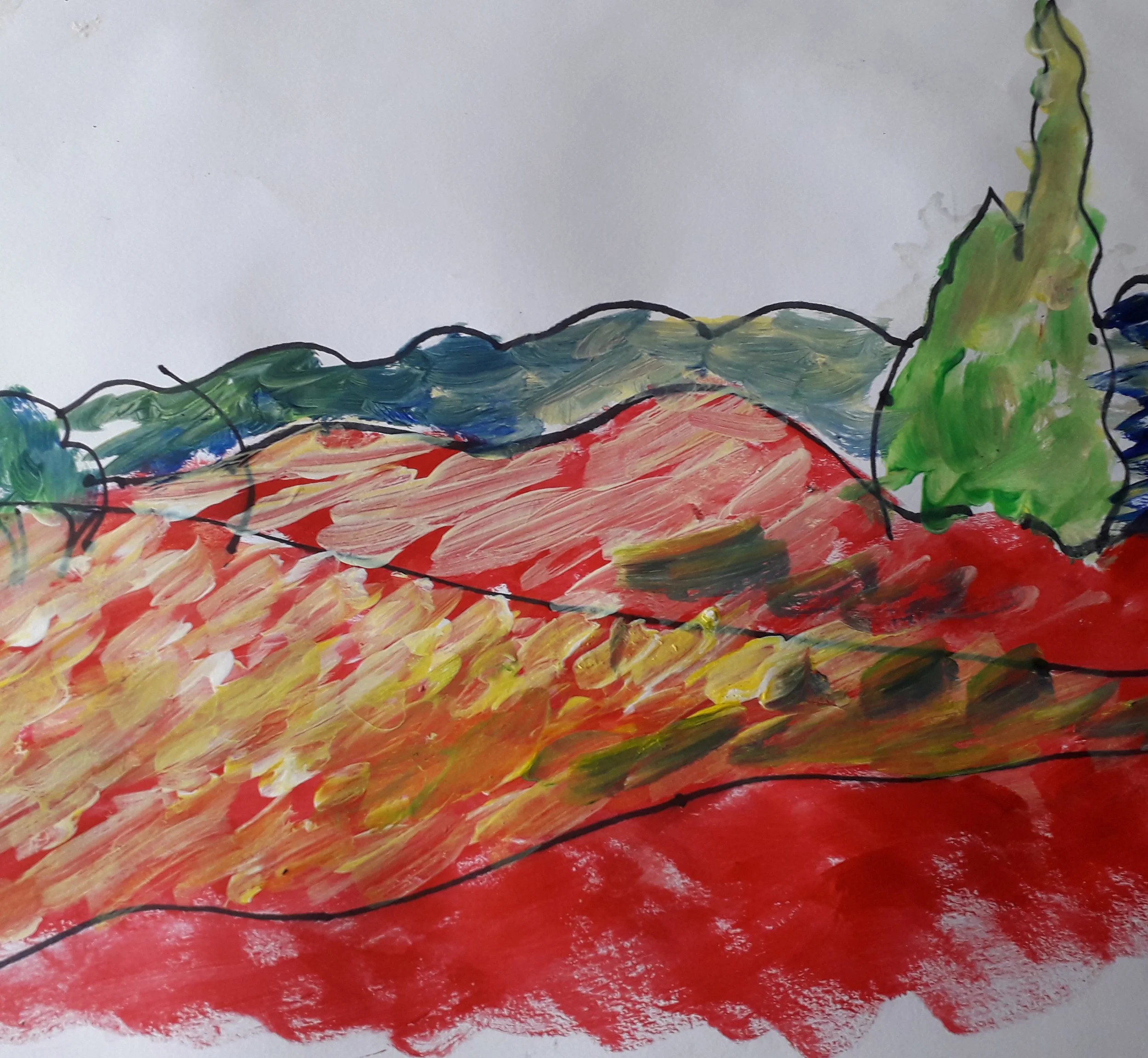 Begin using a colour like red to fill in the wheat field to give contrast to the wheat when we paint over it with darker yellow.