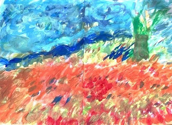 Complete by painting the sky and the foreground broad strokes of paint. Use circles of colour in the sky with blue and some green and a bit of orange.