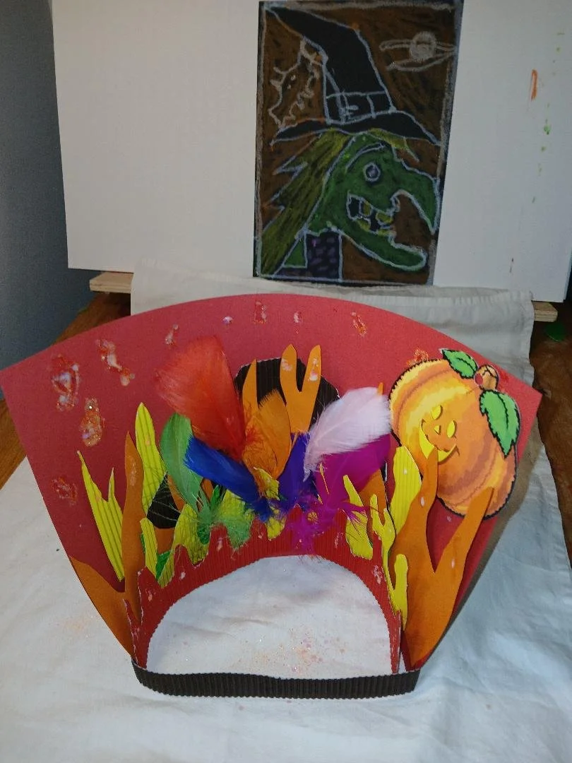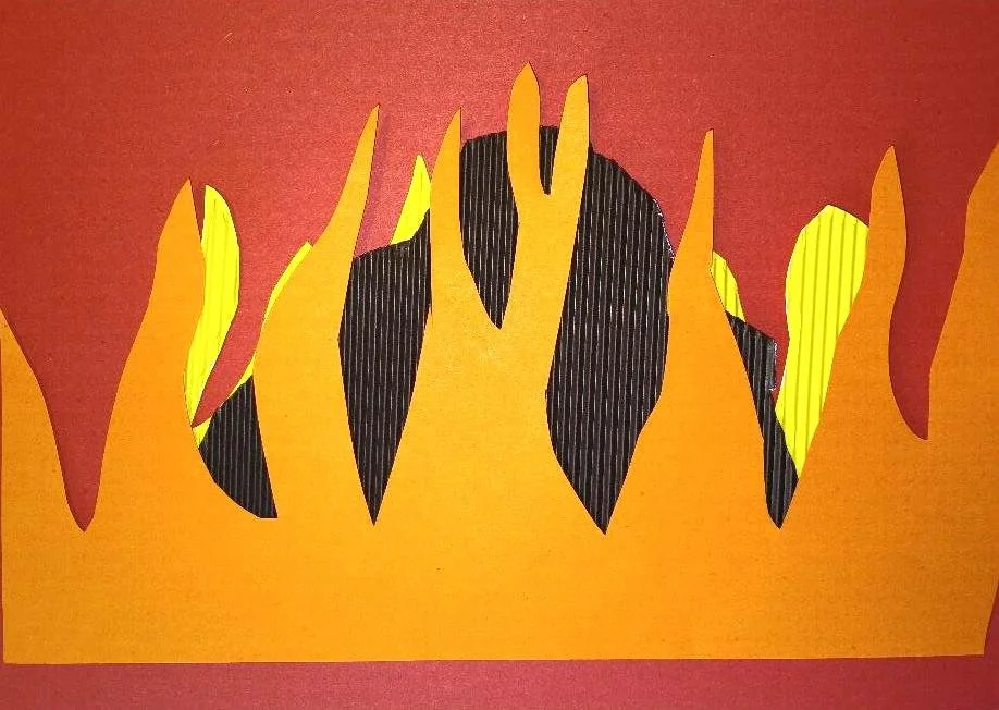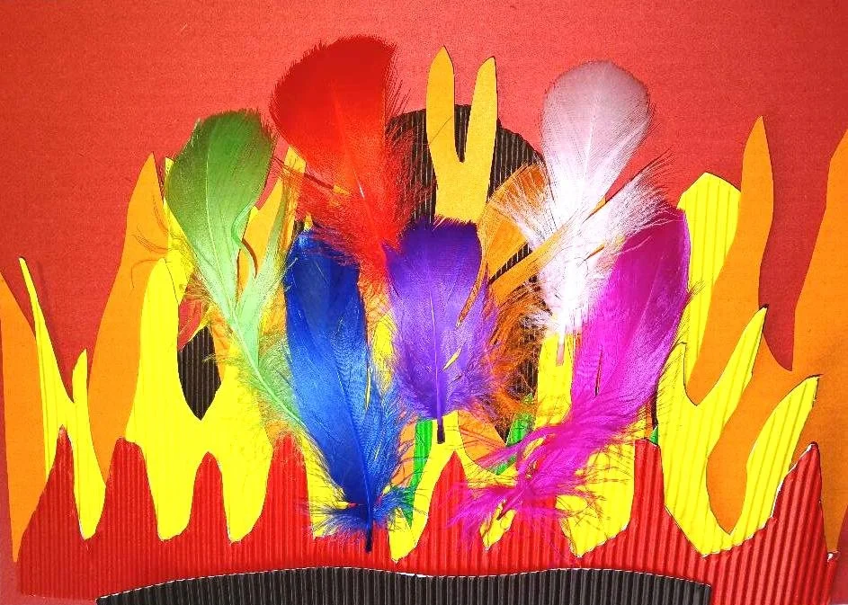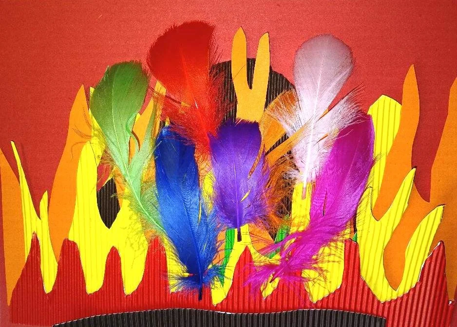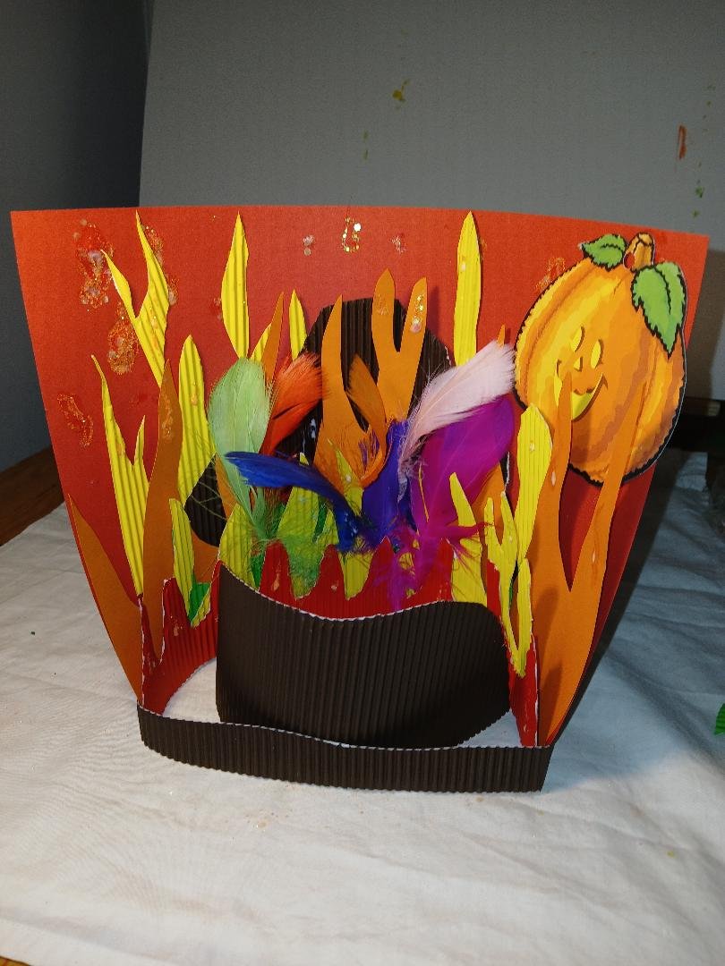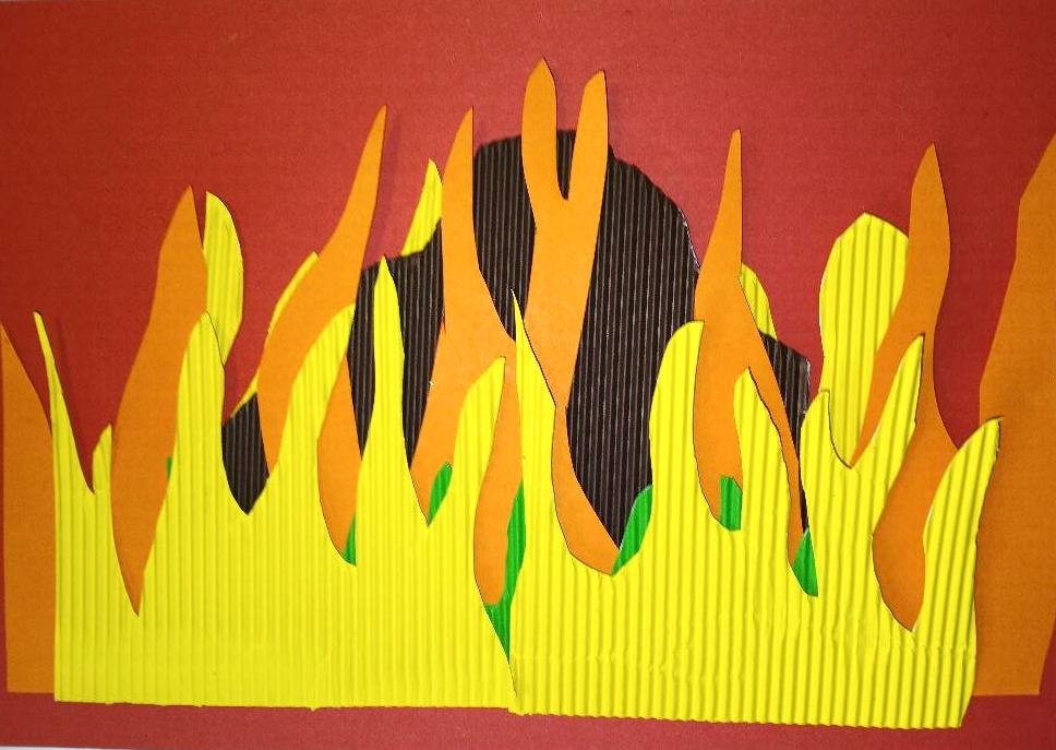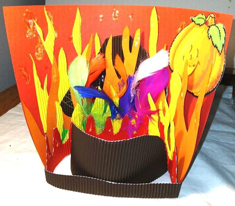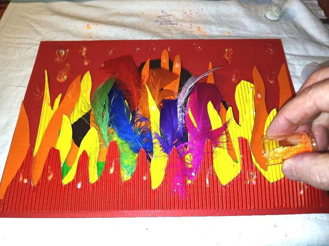 The bonfire is made of coloured card, coloured corrugated card, feathers and glitter.