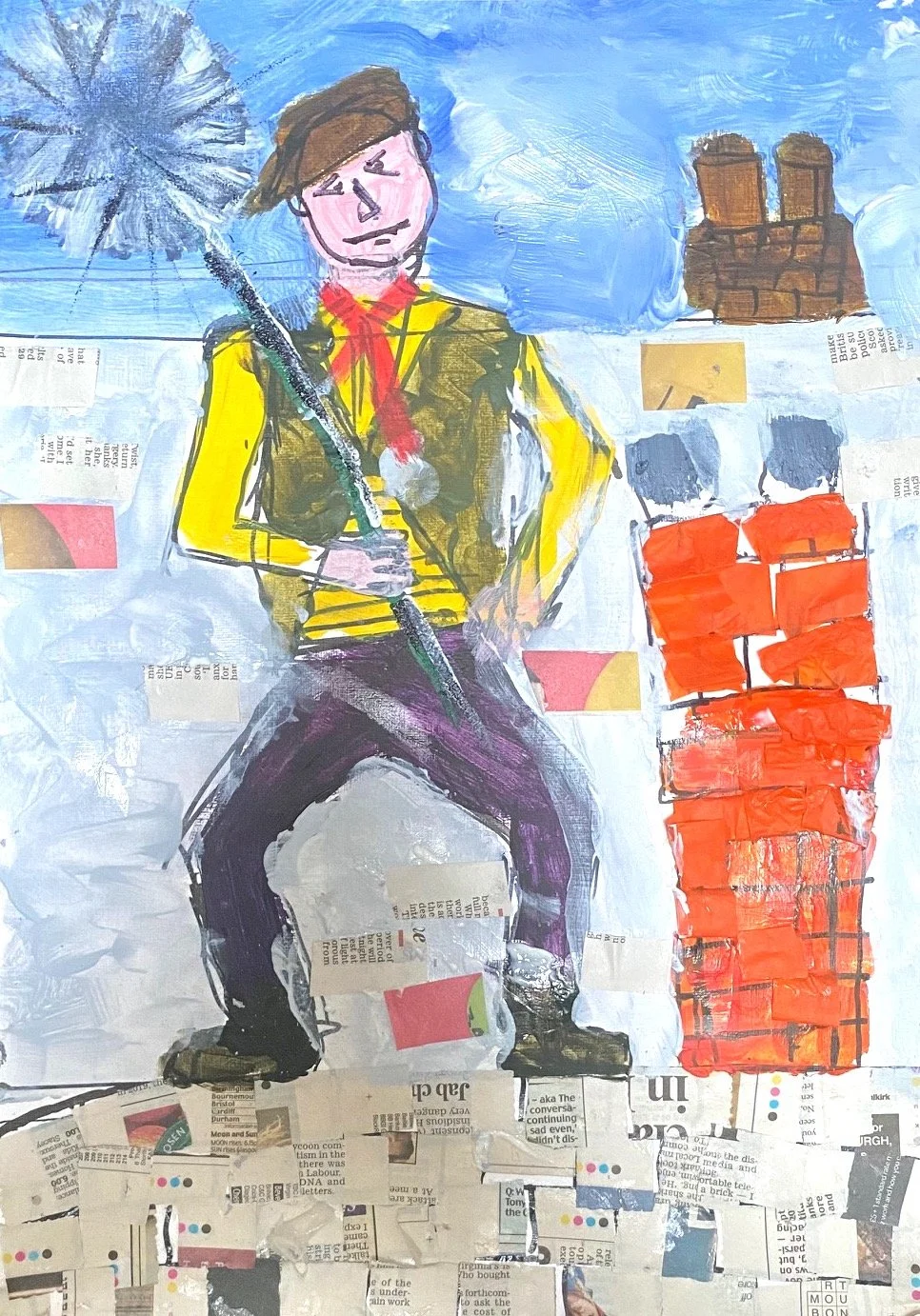 Jemima chose to paint a chimney sweep and wanted to use some mixed media for this painting. So she used some newspaper and glue for the roof tiles.
