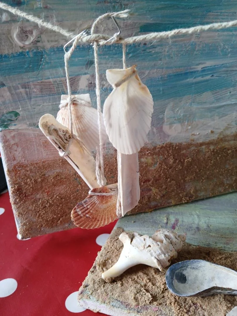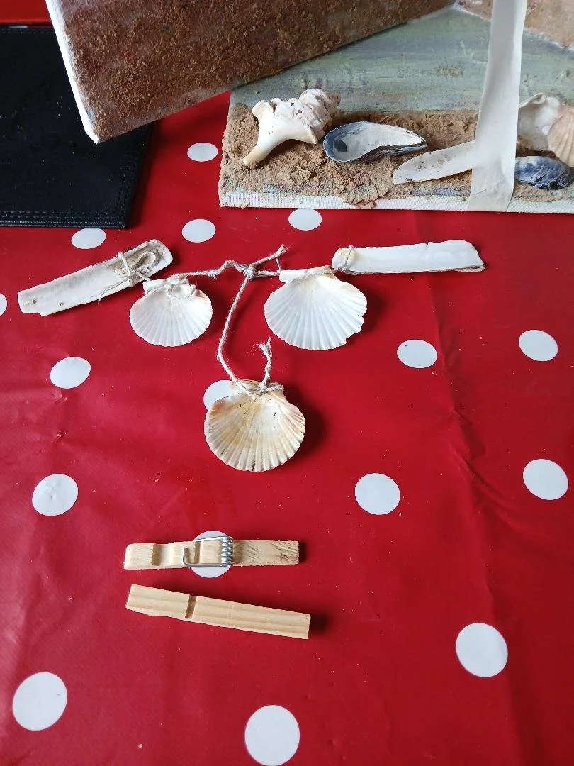Using shells, string and clothes peg and PVA glue.