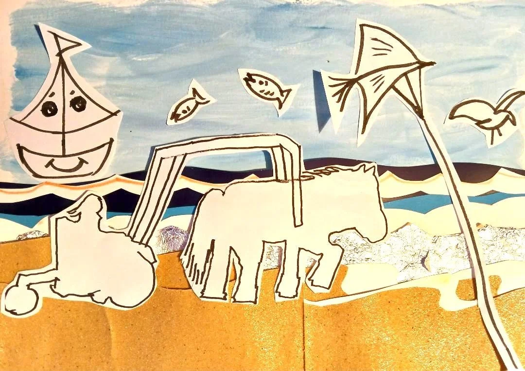 Making the collage for the sea and the sand - using card, paper, silver foil and sand paper.