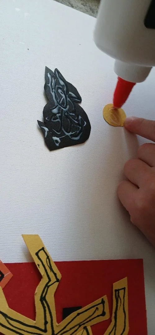 Step 8: Draw feather features on orange card and cut out and paste onto owl.