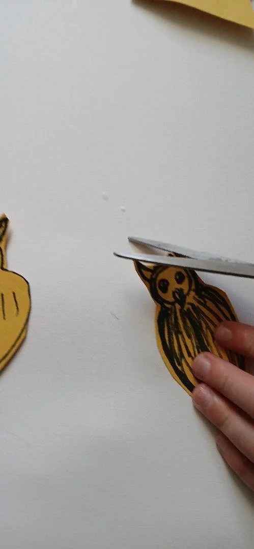 Use off cut yellow card for the owl and bat. Off cut black card for the cat.