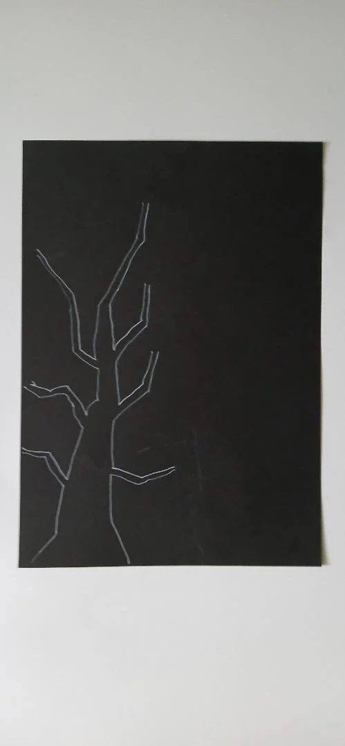 Step 1: Draw out 3 trees in white pen pr pencil on black card and cut out leaving a space around the outline.