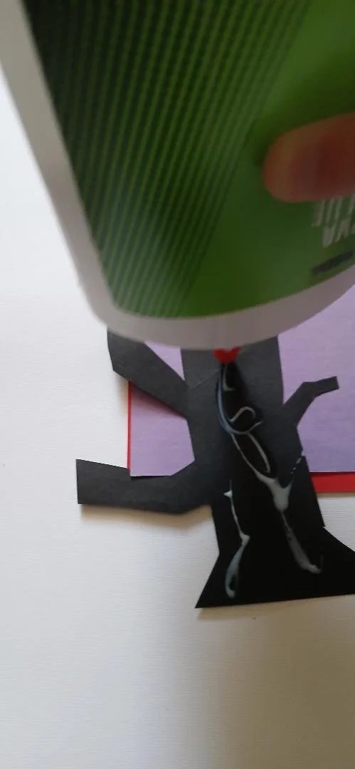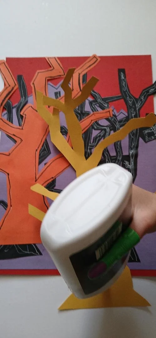 Step 2: Put PVA glue on back of 3 black trees after cutting these out and place onto the background with stumps about an inch from the base.