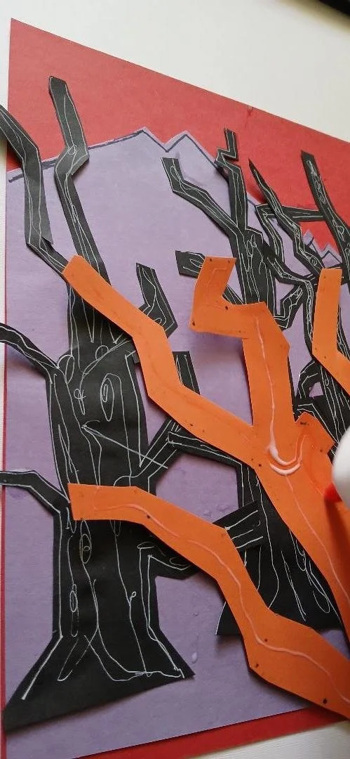 Step 3: Draw a spooky tree with black pen, cut out orange tree in the same way. Place to the left and glue on.