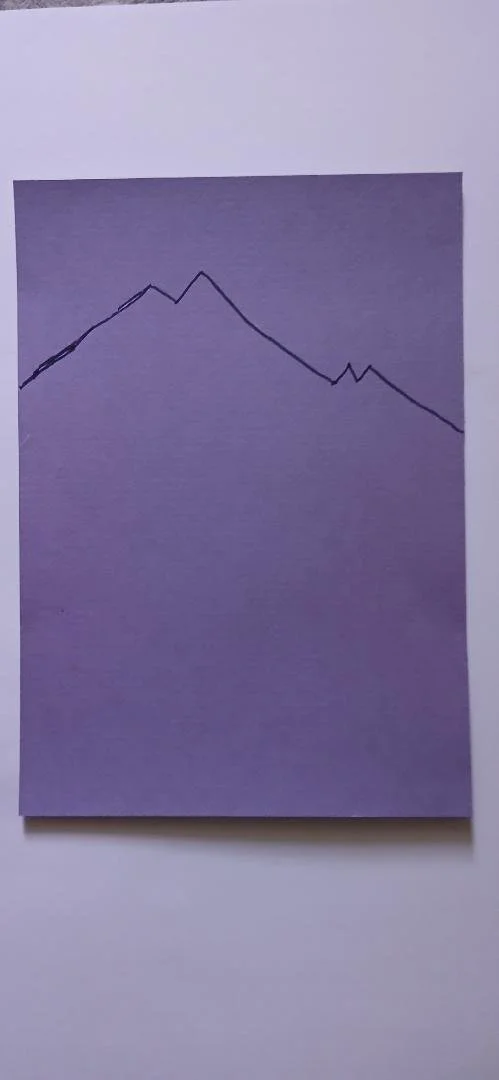 Draw a mountain scene on purple colour card and cut out for the background. Put this onto a full piece of A4 red card.