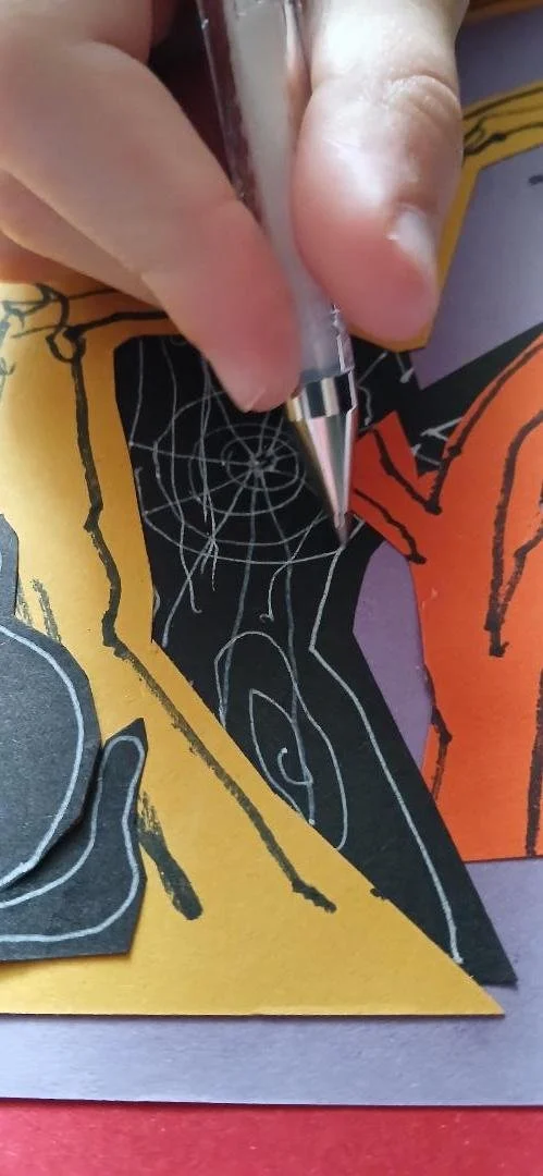 Draw on the spiders cob webs and any other feature wanted with white pen or pencil.