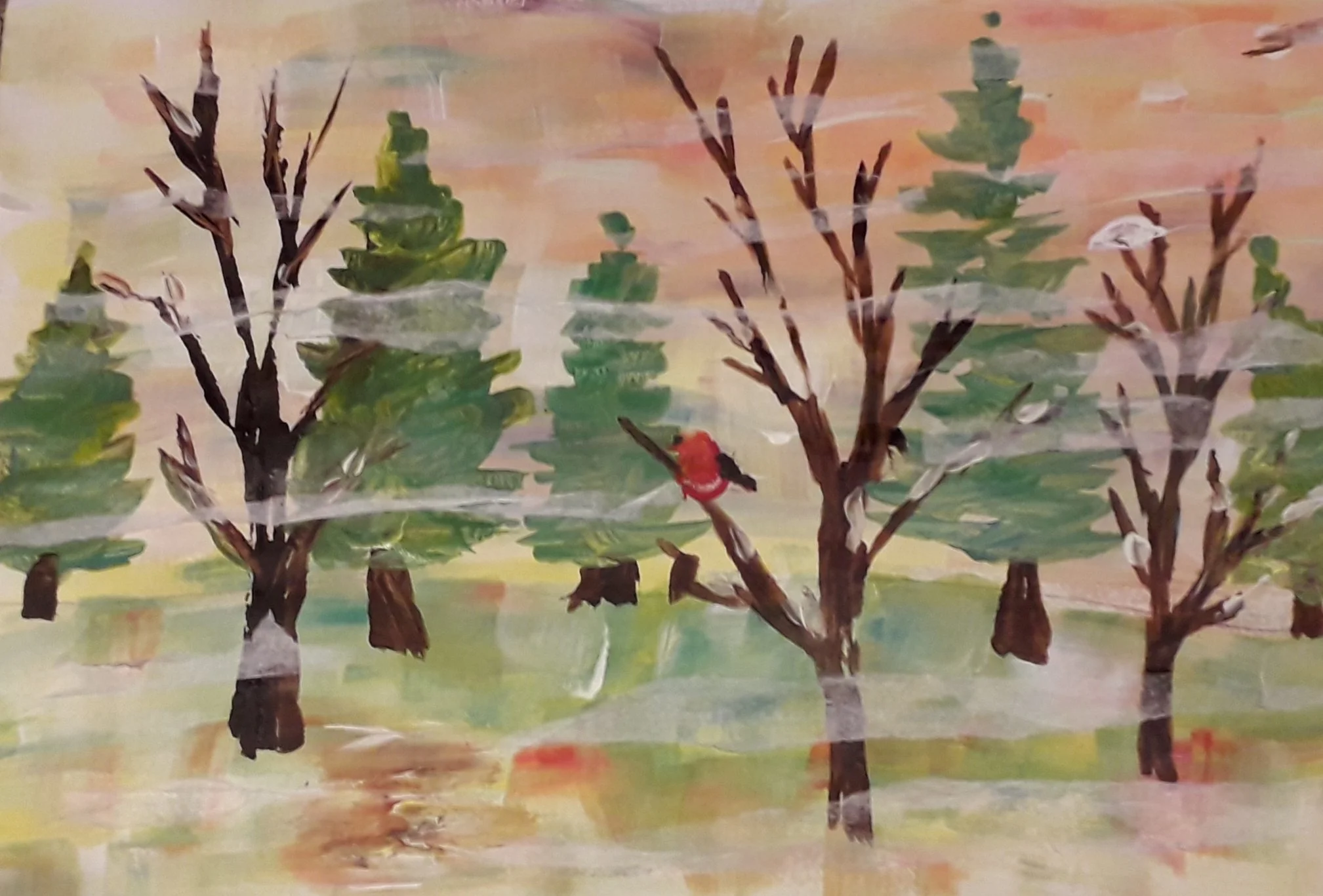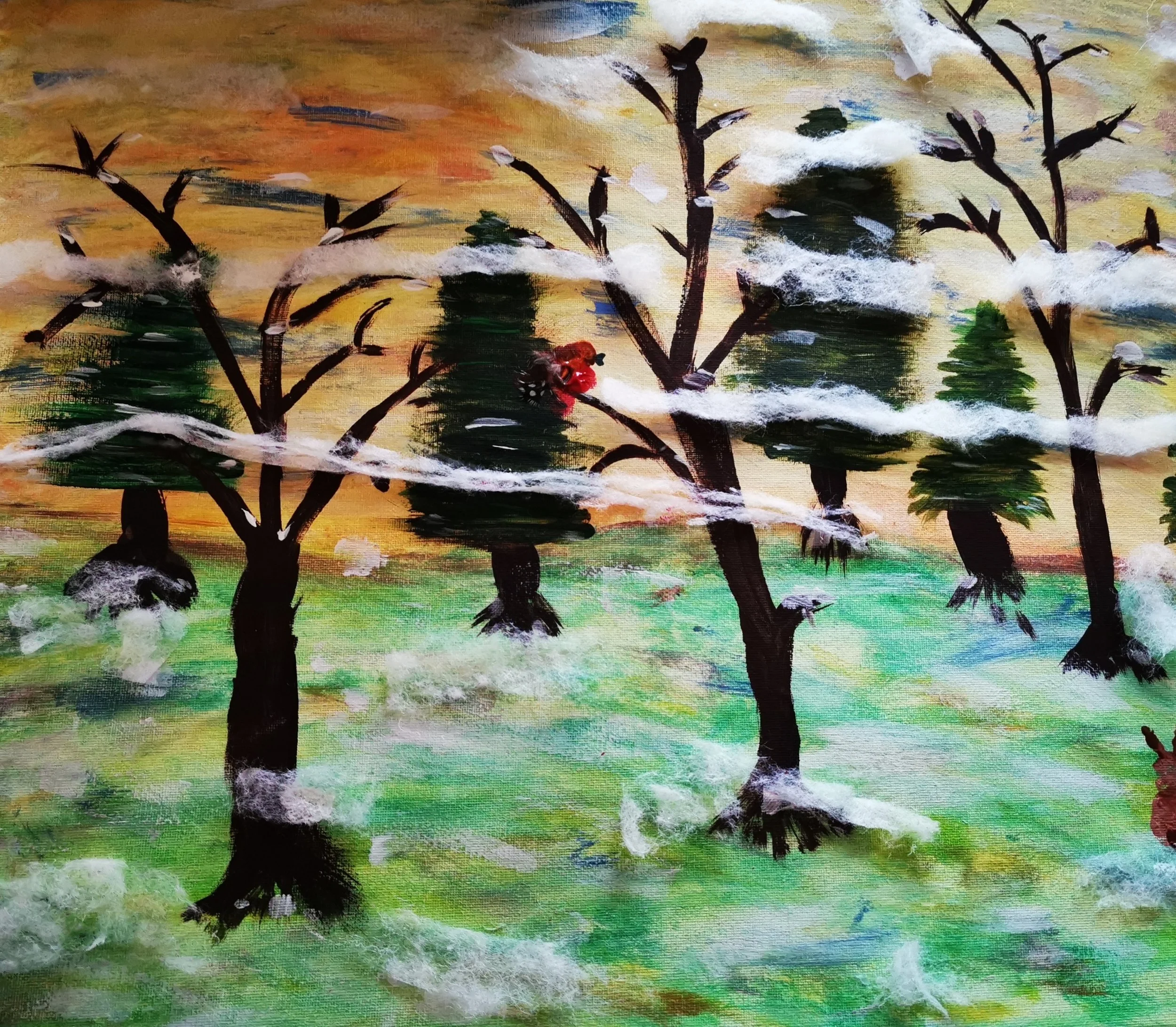 Using acrylic paint and tissue paper with a little robin in the tree.