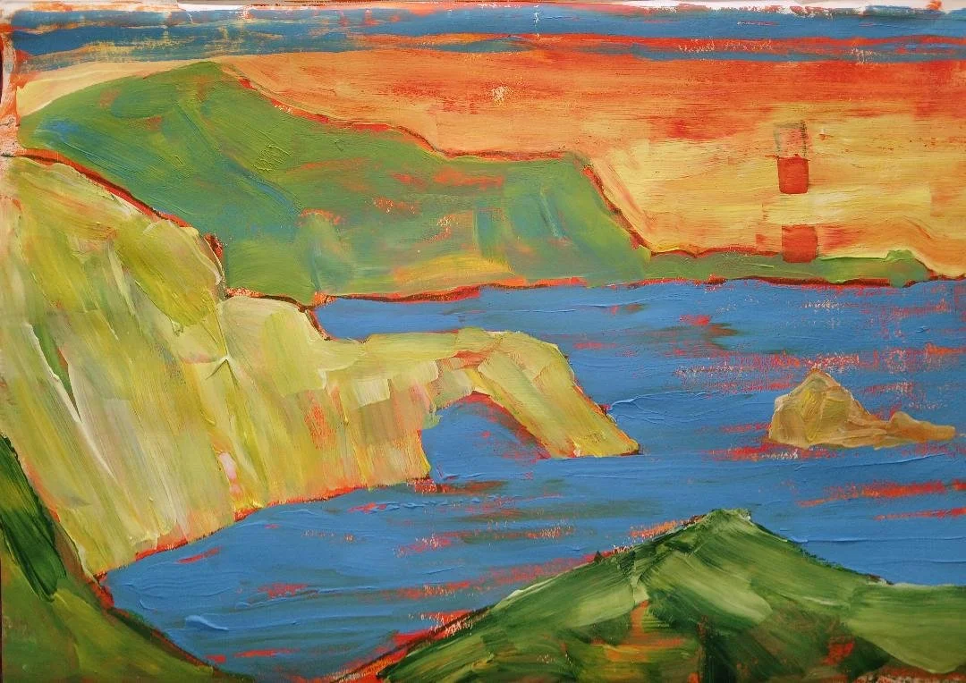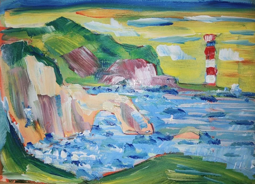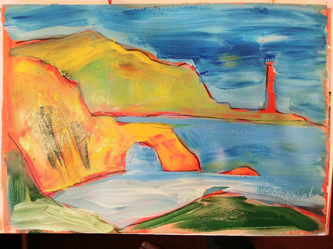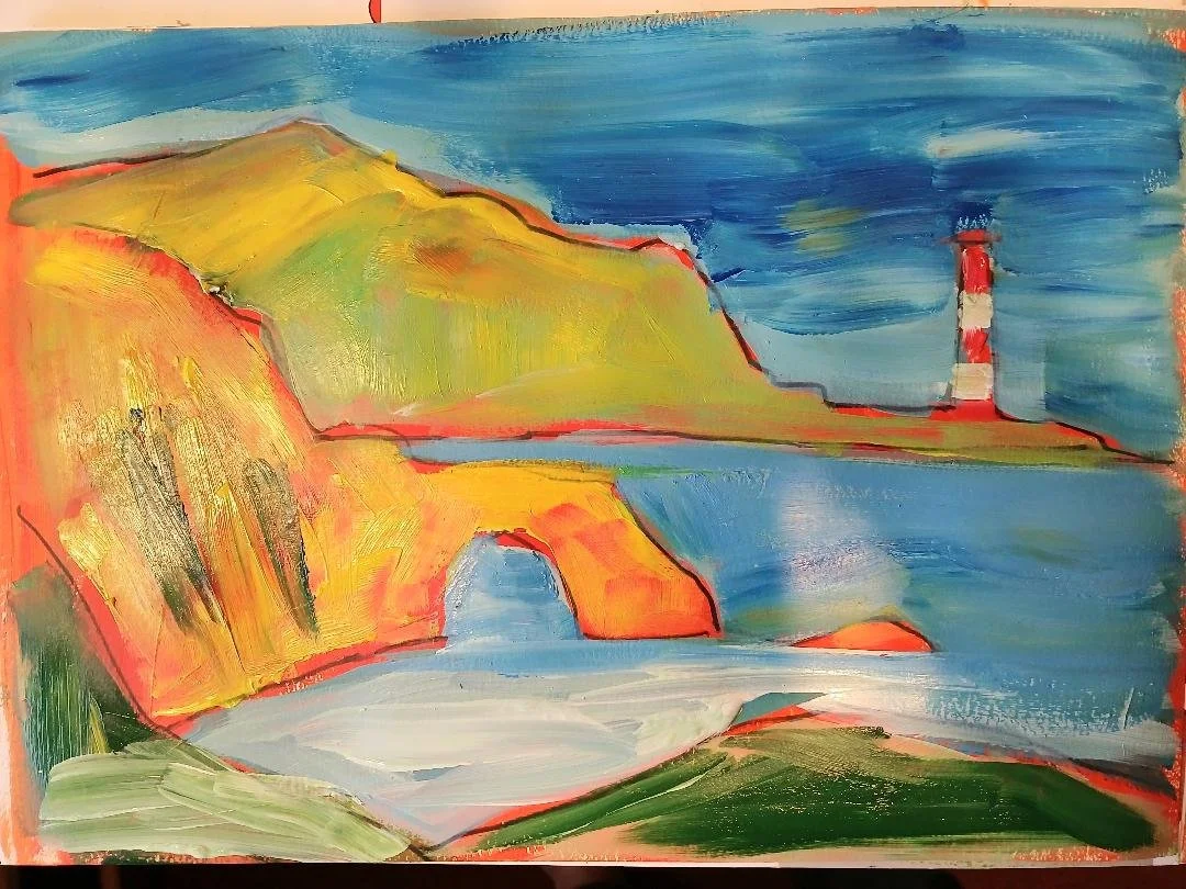 Add colour for the lighthouse and then build the landscape with seagulls, boat etc.