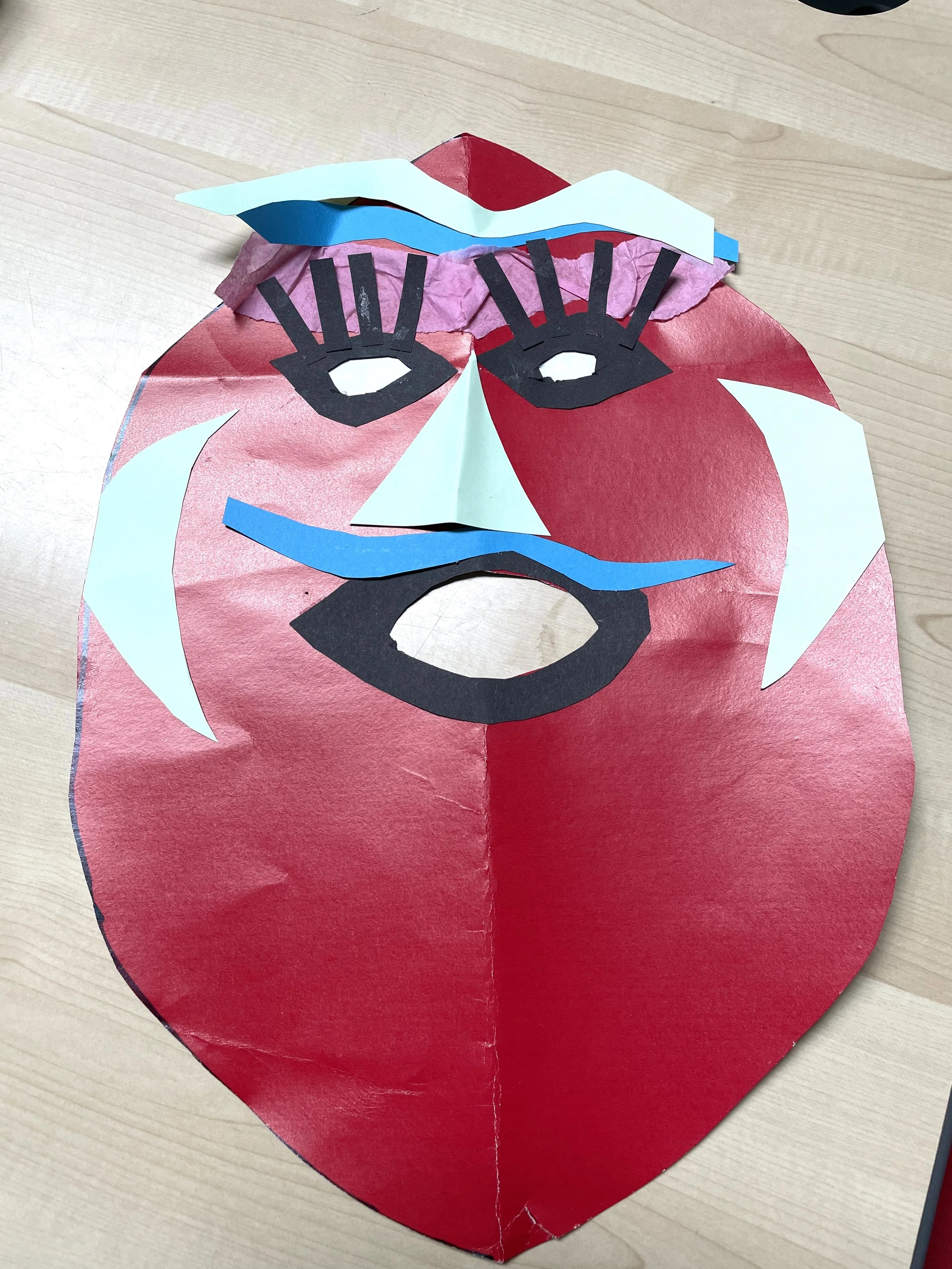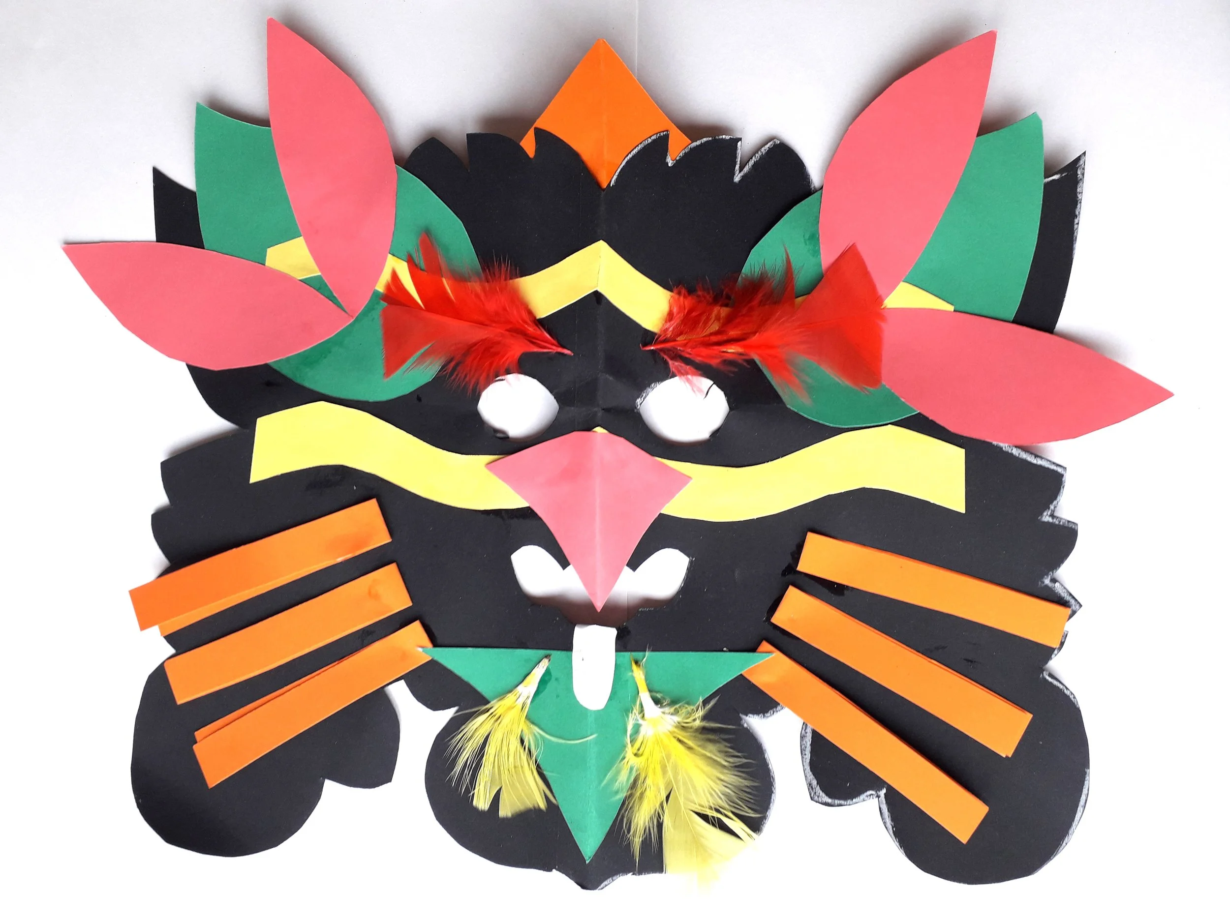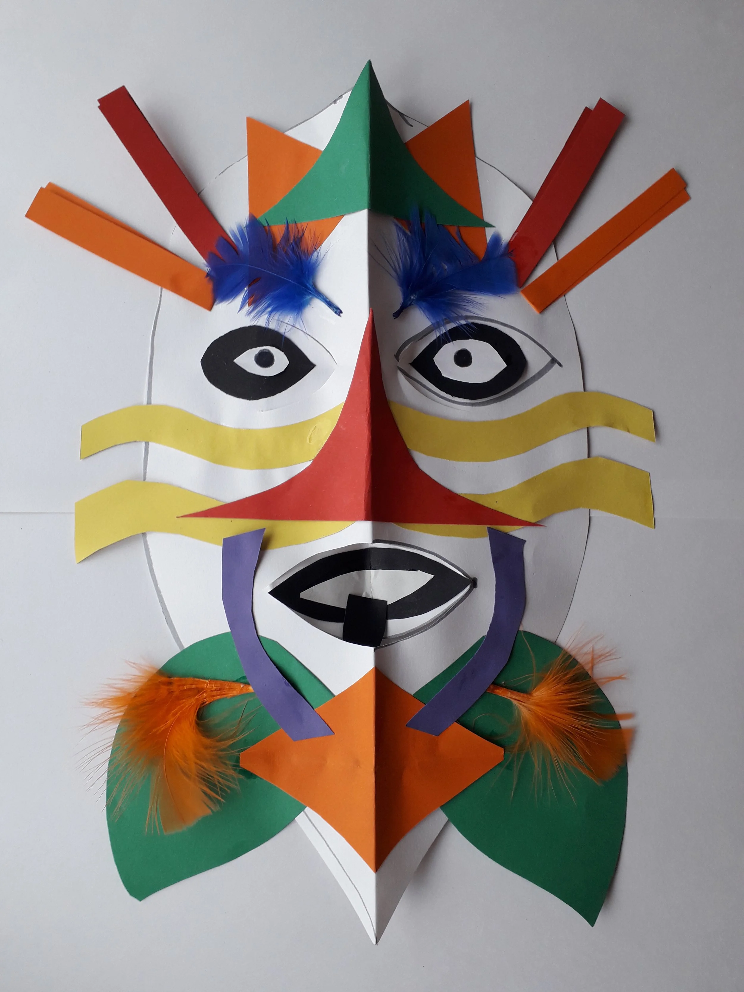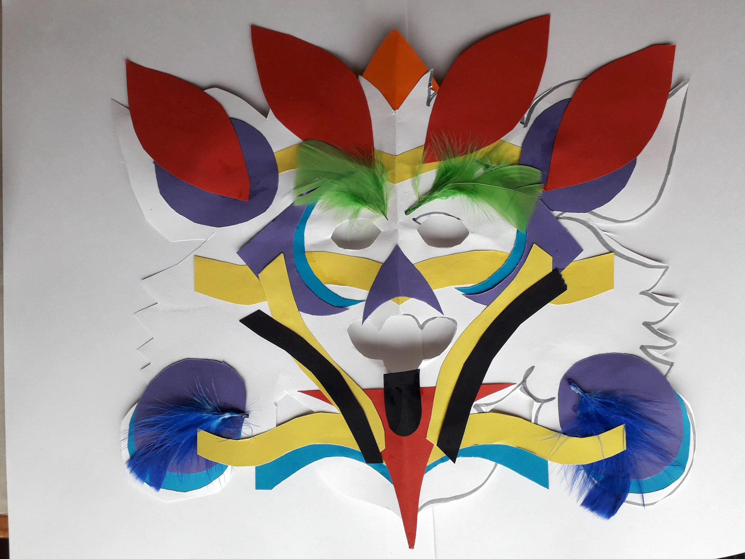 Step 4. Position the long pieces across the mask and paste. Place the wavy strips on either side of the mask to make further shapes. Place other shapes on the mask on one side, and copy on the opposite side to show balance.