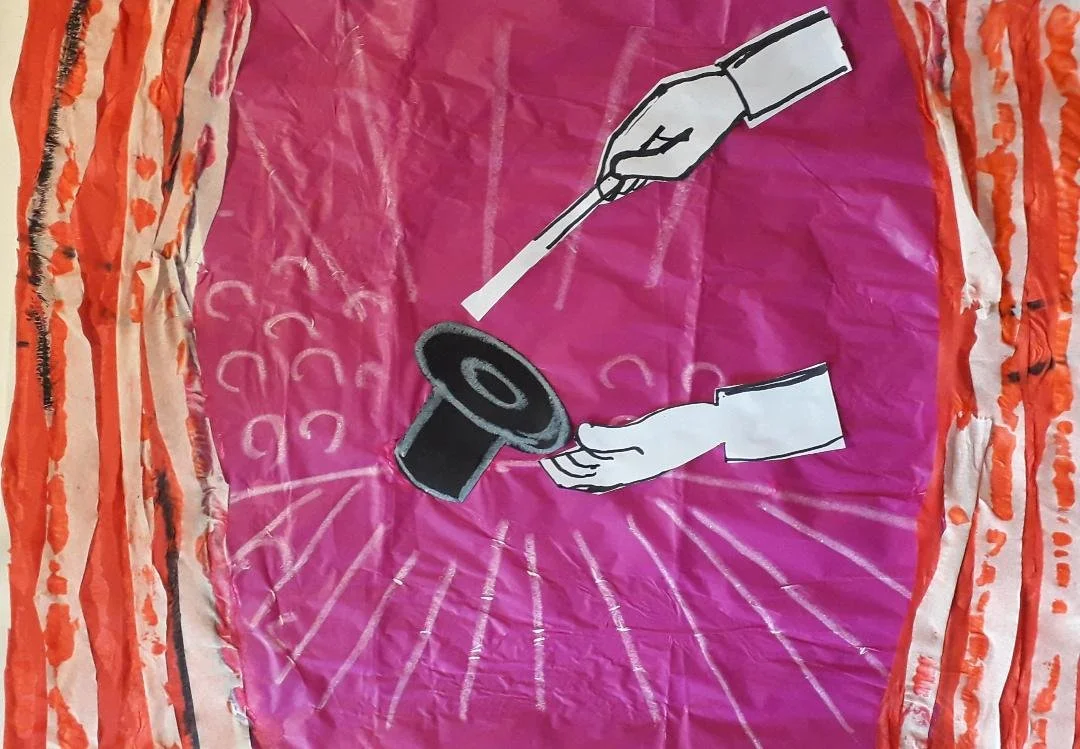 Once the background and curtains have been pasted on, position the hands and the wand on an angle to show the magic trick. Then paste on.