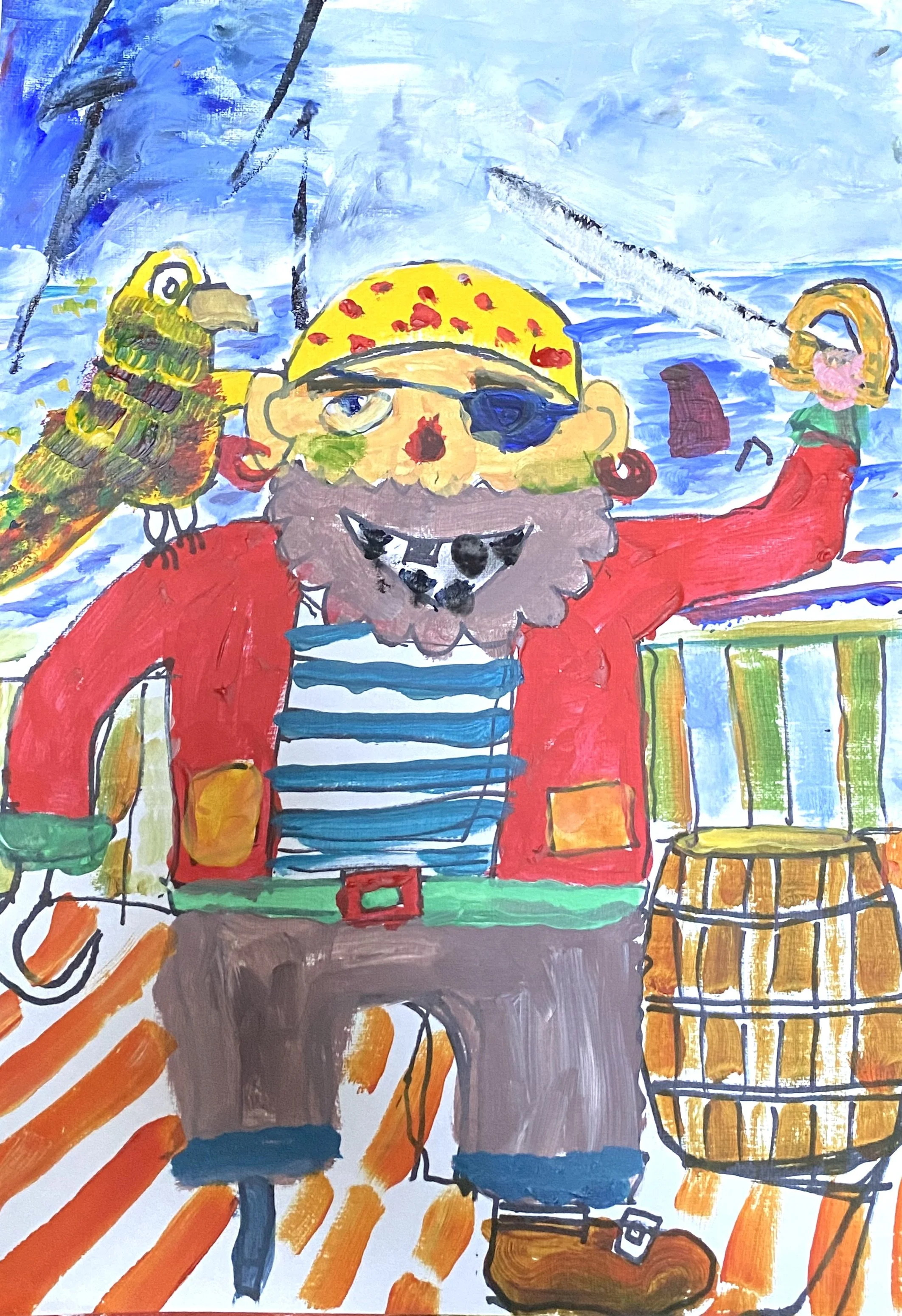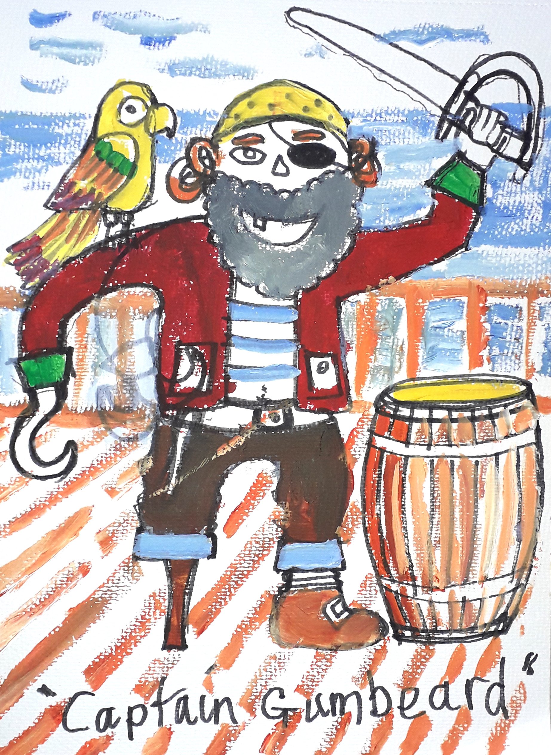 Aaaaarrrhhhh!! Jemima painted Captian Gumbeard, with his parrot perched on his shoulder. Jemima had help from her dad, and they drew out the pirate using black pen.