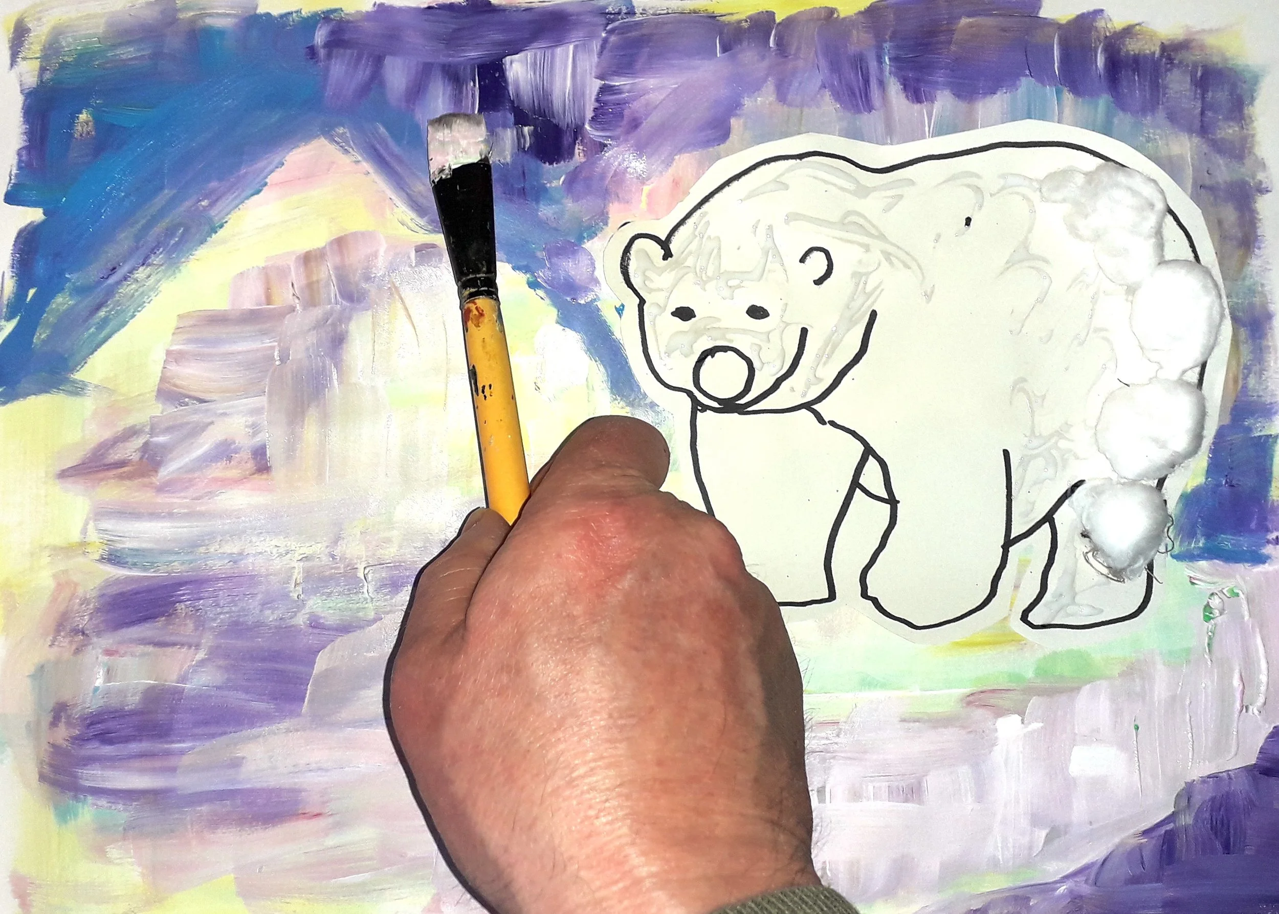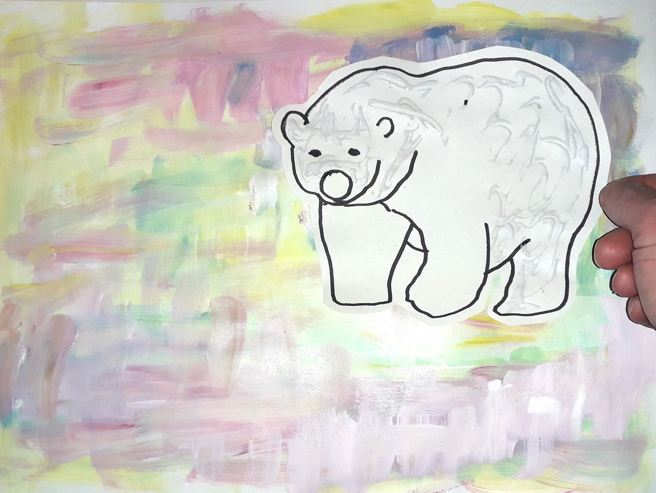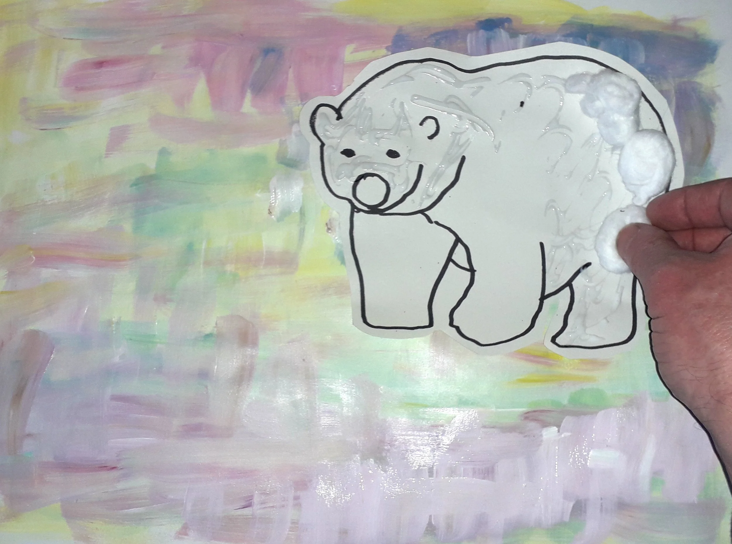 Cut out template for little bear and paste onto left side. Paste cotton wool on.