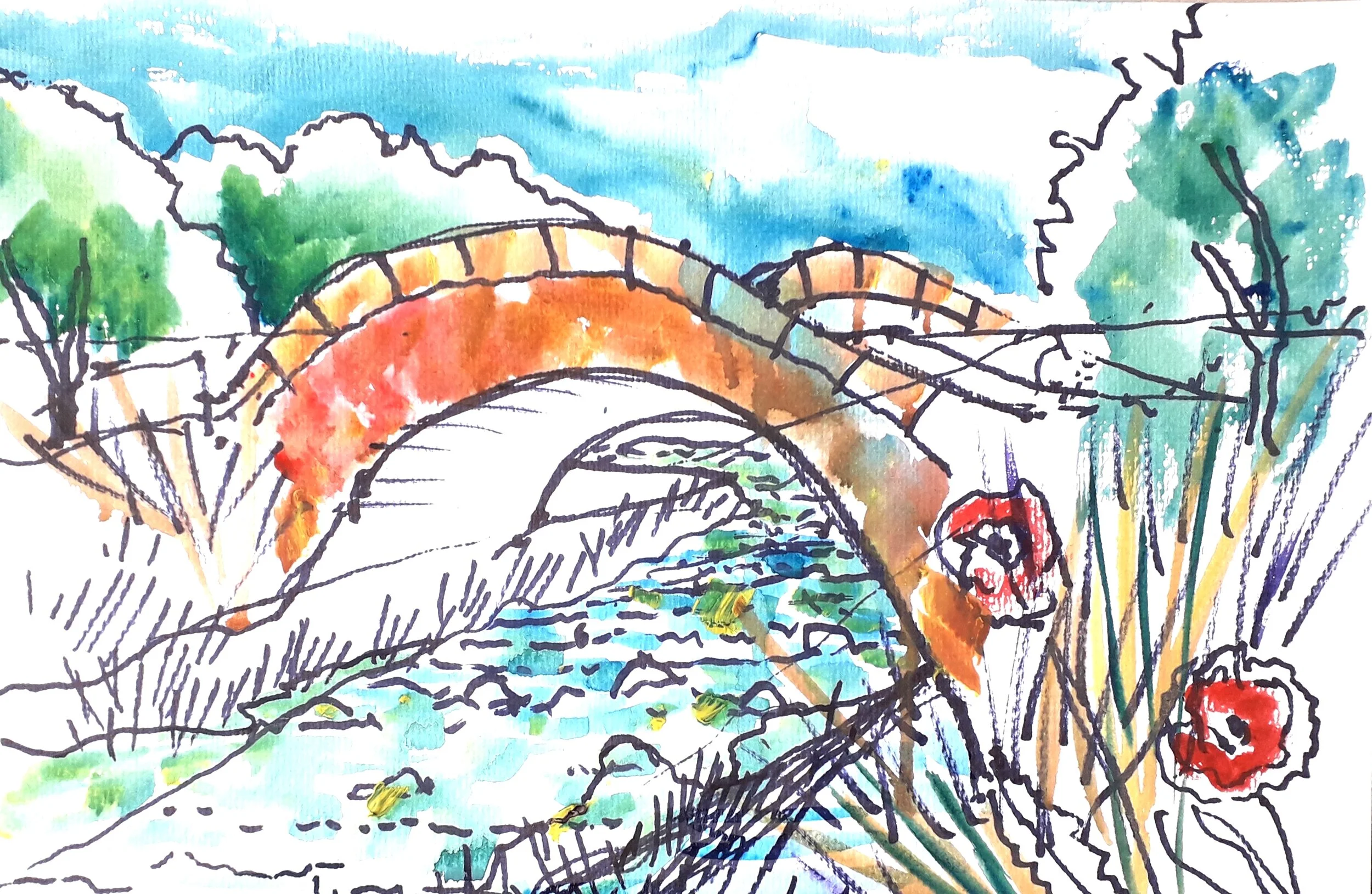 David’s drawing and watercolour painting example, made while instructing using watercolour painting techniques and perspective drawing. The scene is imaginary.