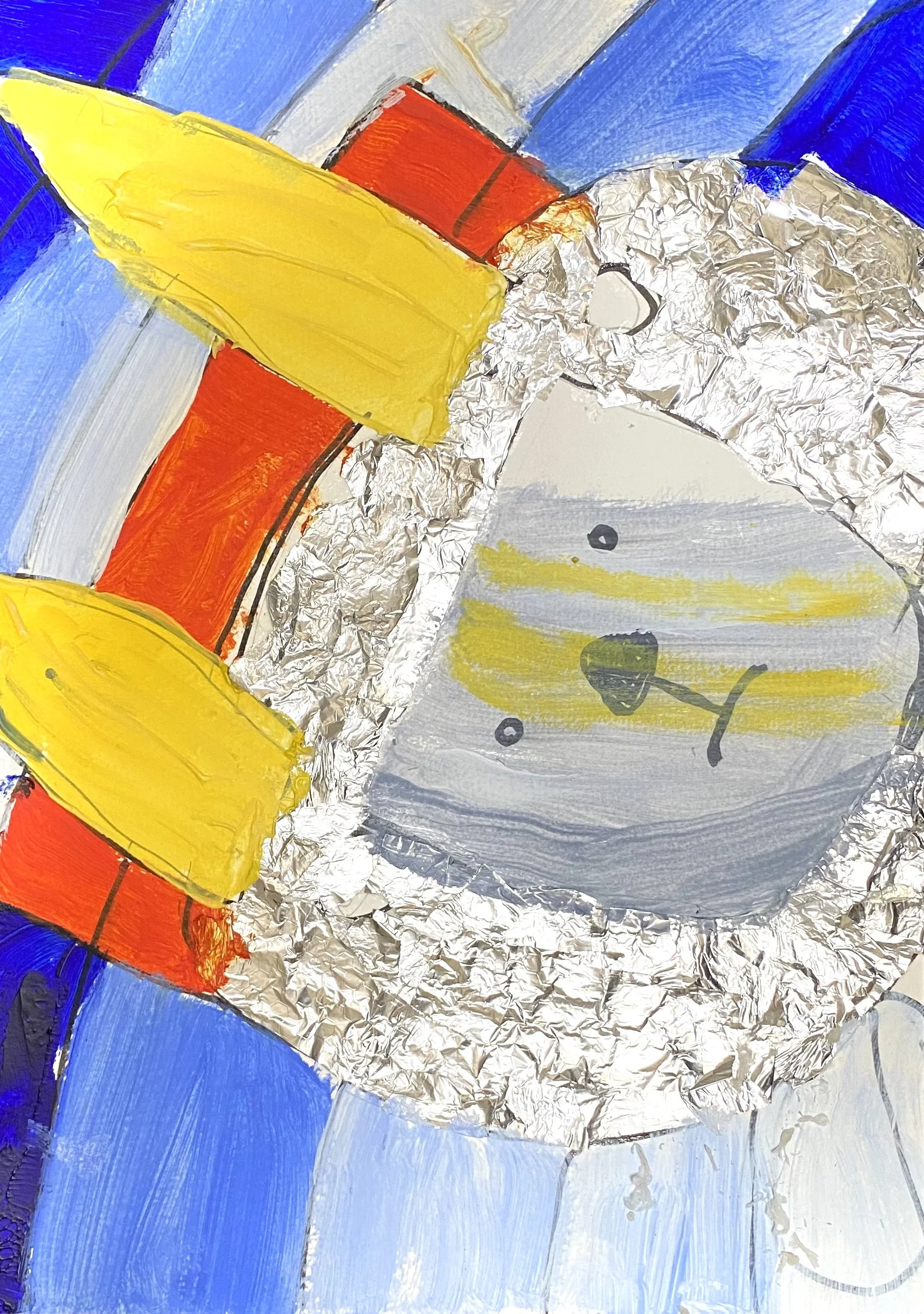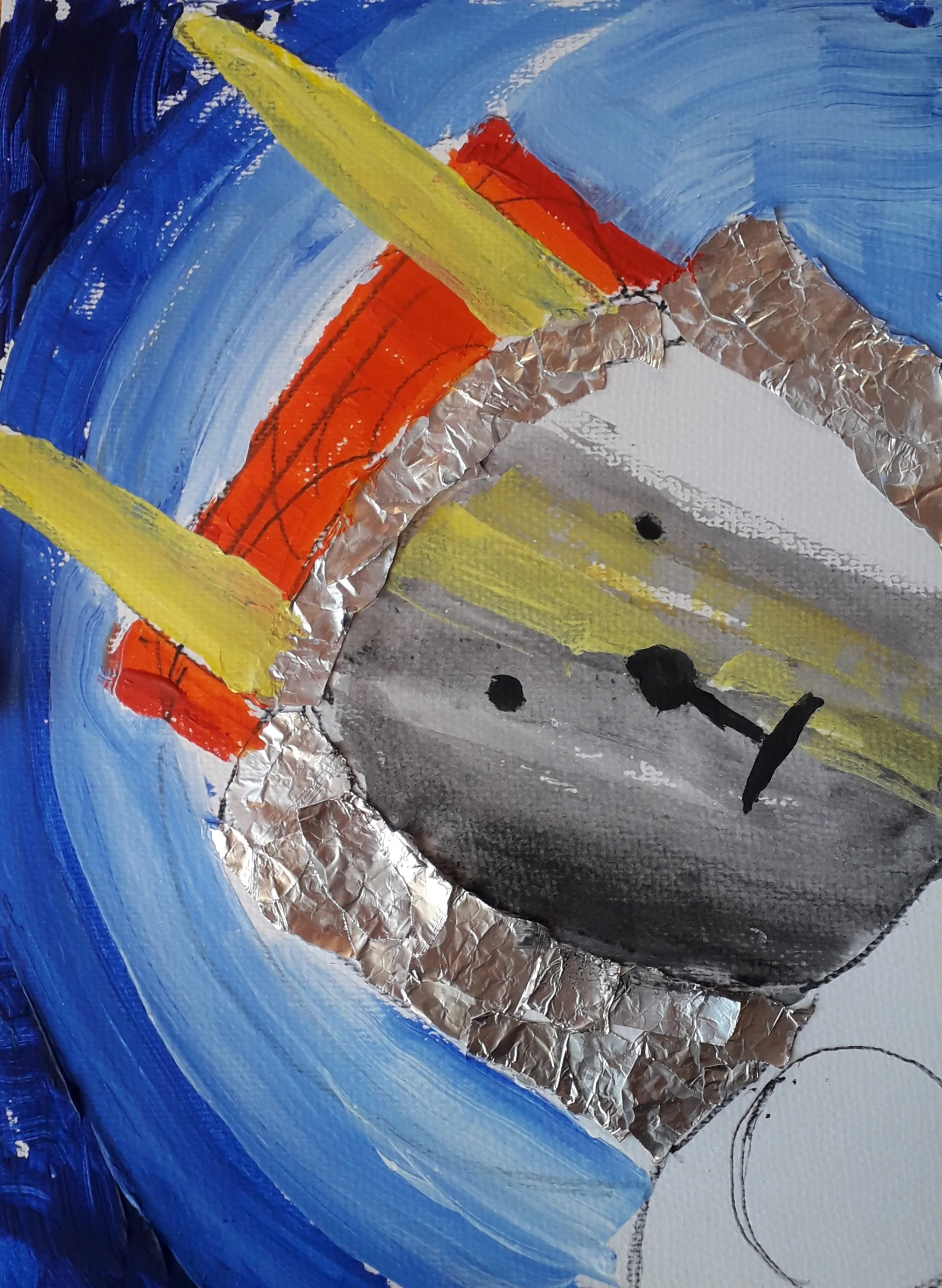 David showed how to draw out the astronaut helmet so that it was quite large on the paper, and on an angle. We firstly put silver foil on in small pieces with PVA because this is a better glue for sticking silver foil. Then we added paint for the rest of the helmet and the background using bflat brushes then fingers.