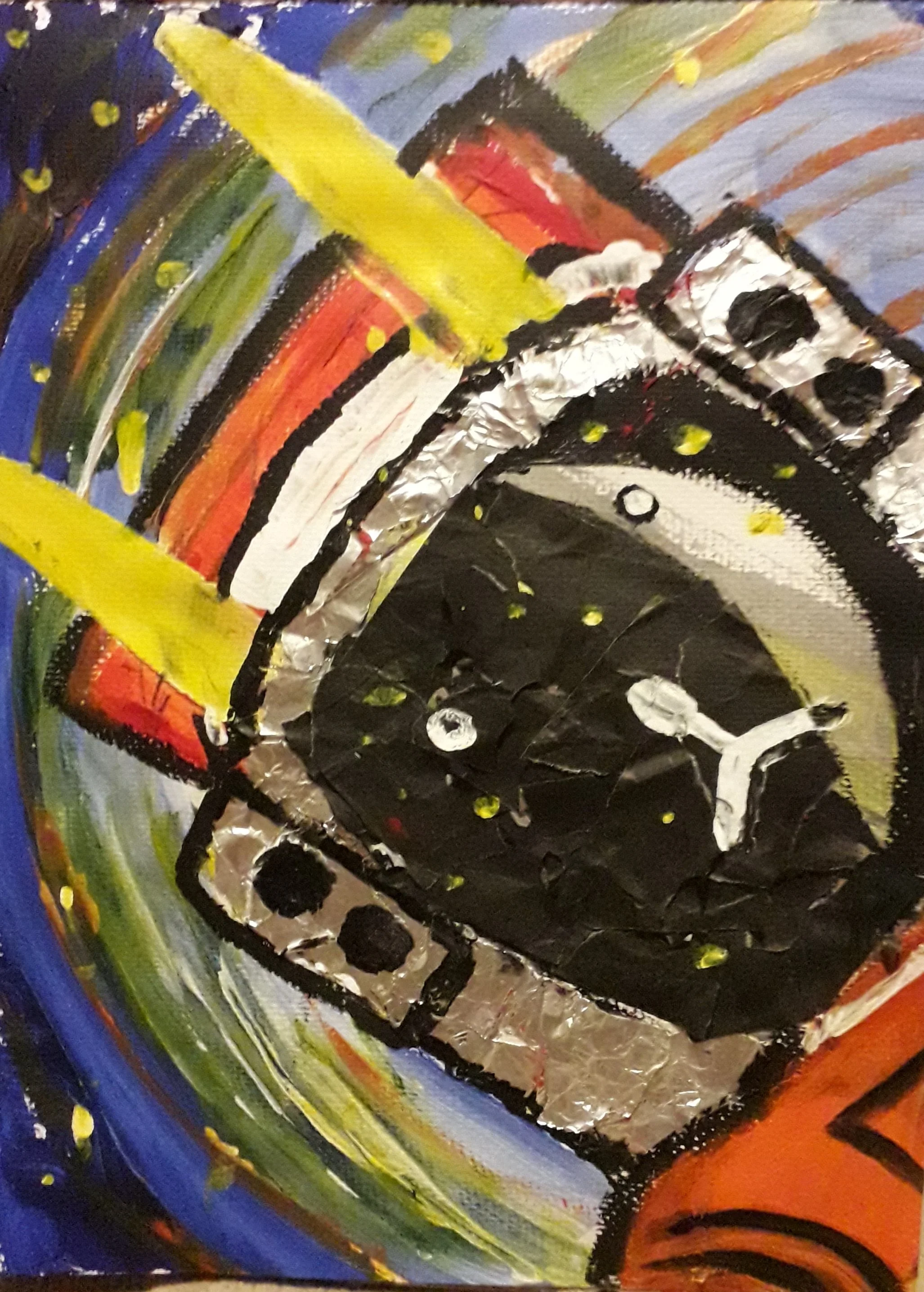 She went on to add black tissue paper collage for the the helmet visor and painted the rest of the painting with assistance from her dad.