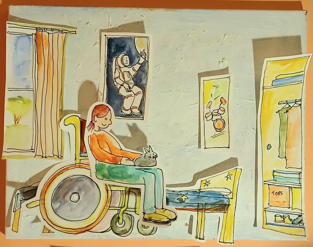 Stella in her wheelchair (Mission to the Moon) and Stella the Astronaut- clay modelling
