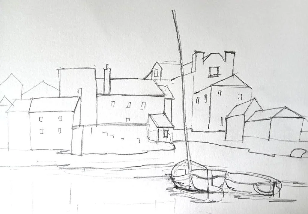 Pencil drawing using basic shapes for the buildings and keeping the building landscape to the middle third of the image.