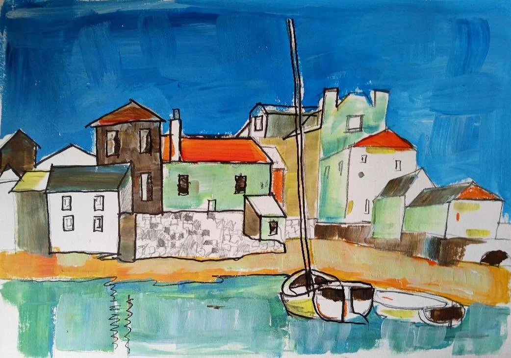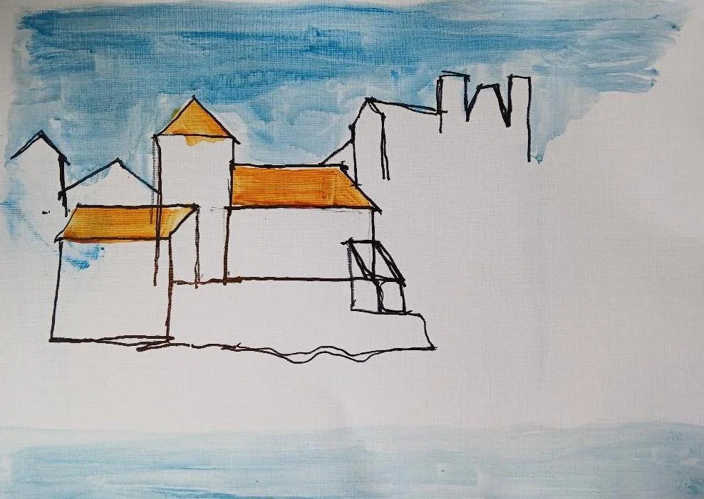 Add watercolour - sky, sea and buildings, leaving some buildings white.