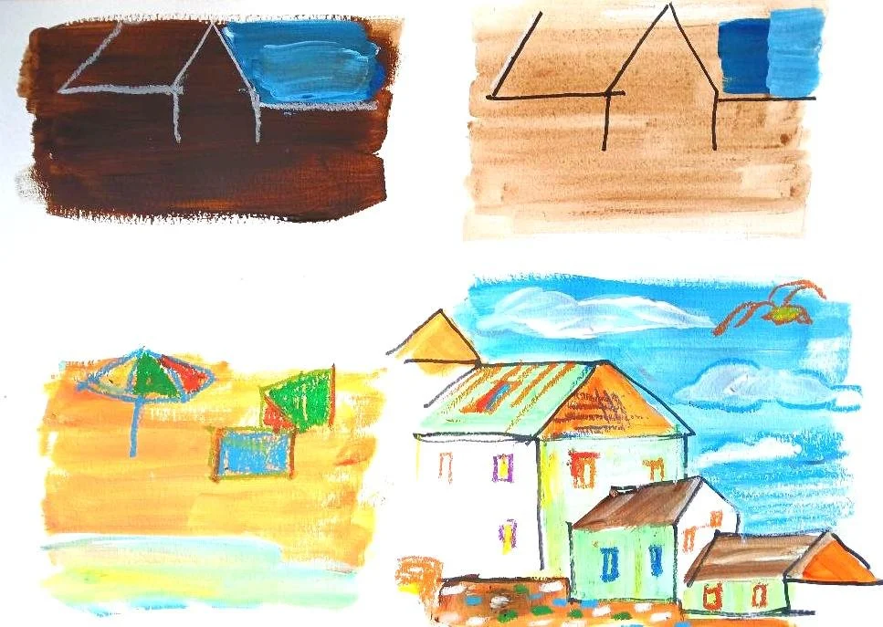 Using pencil and pen drawing, watercolour and acrylic with oil pastel.