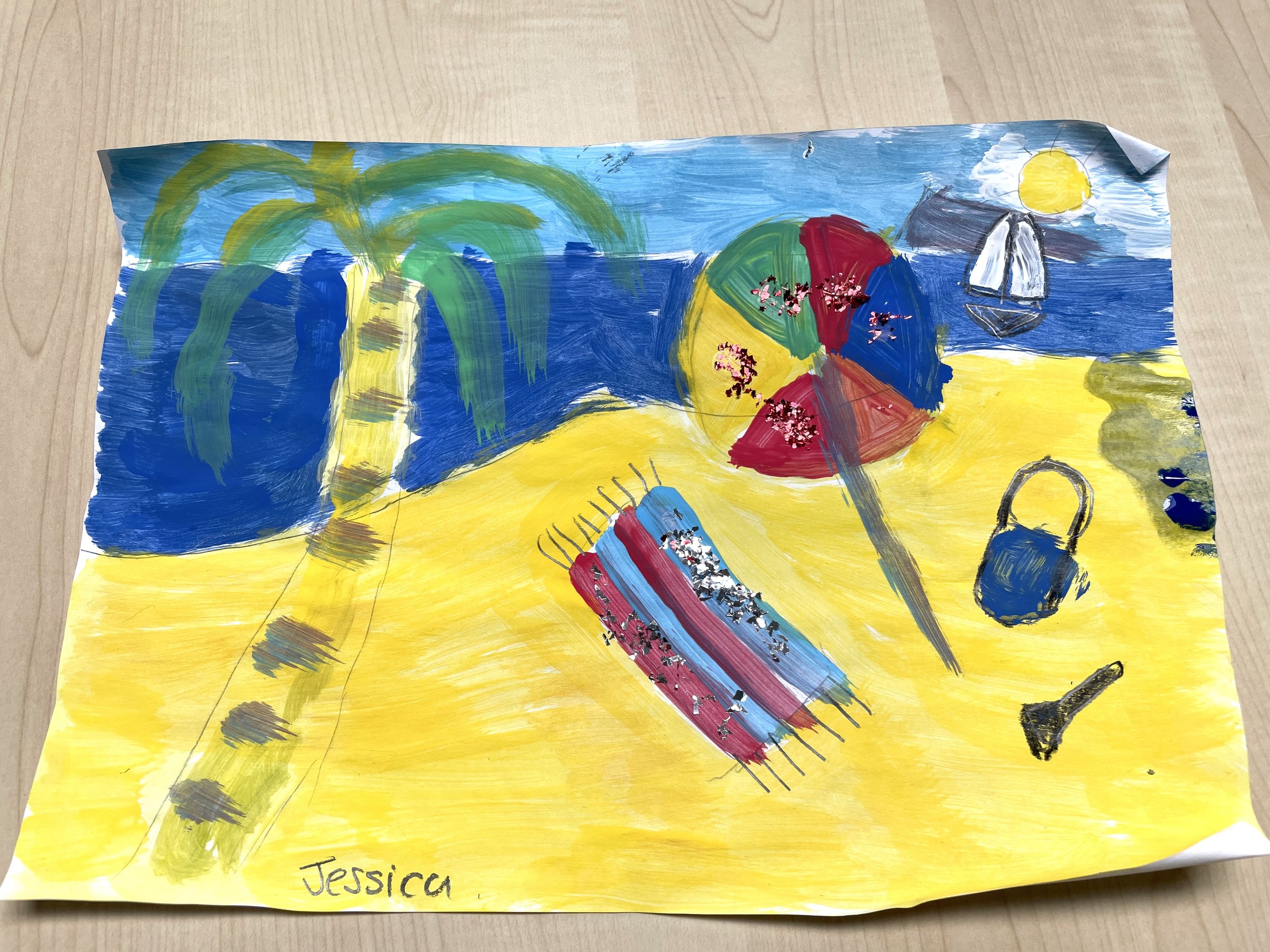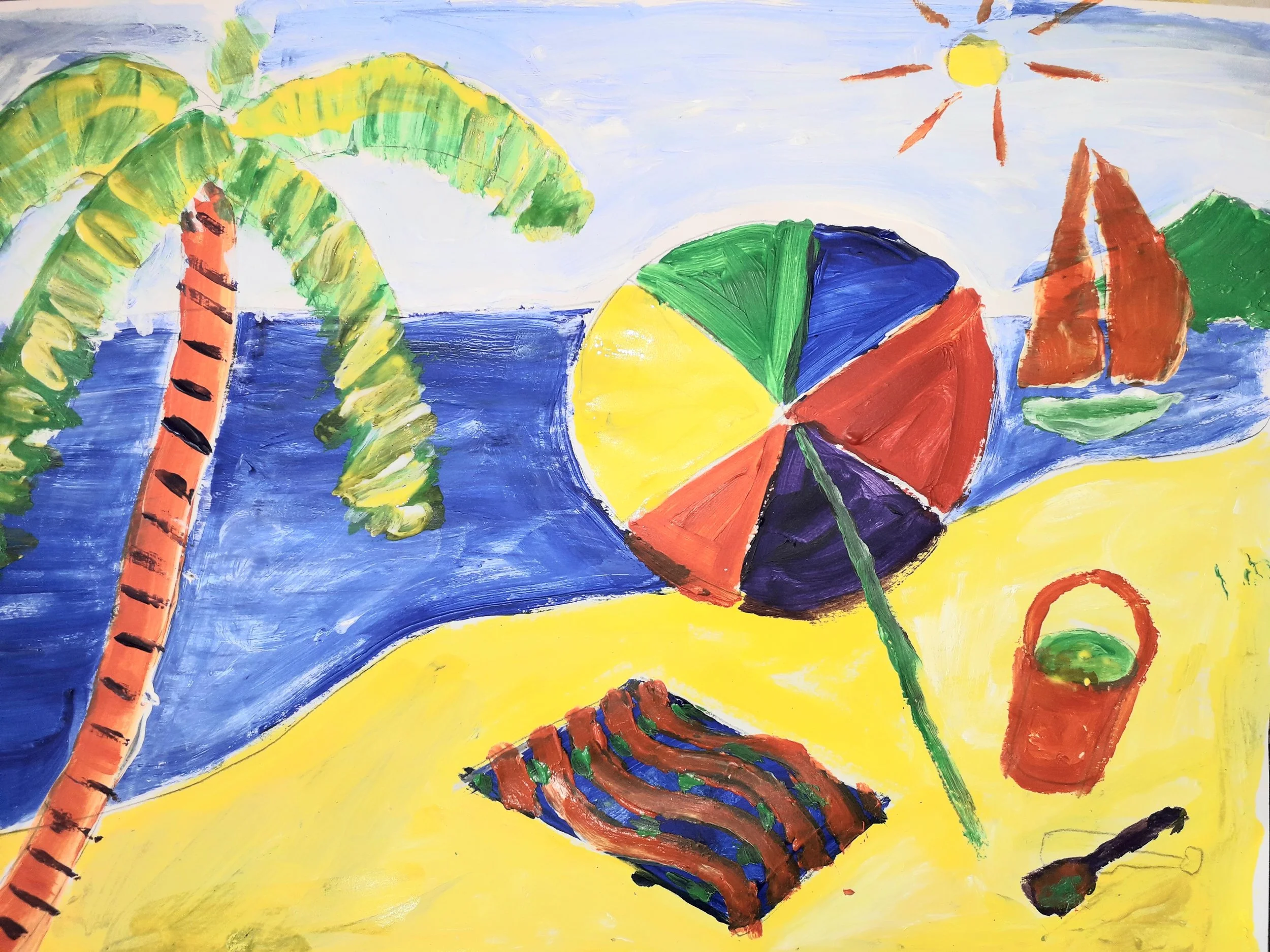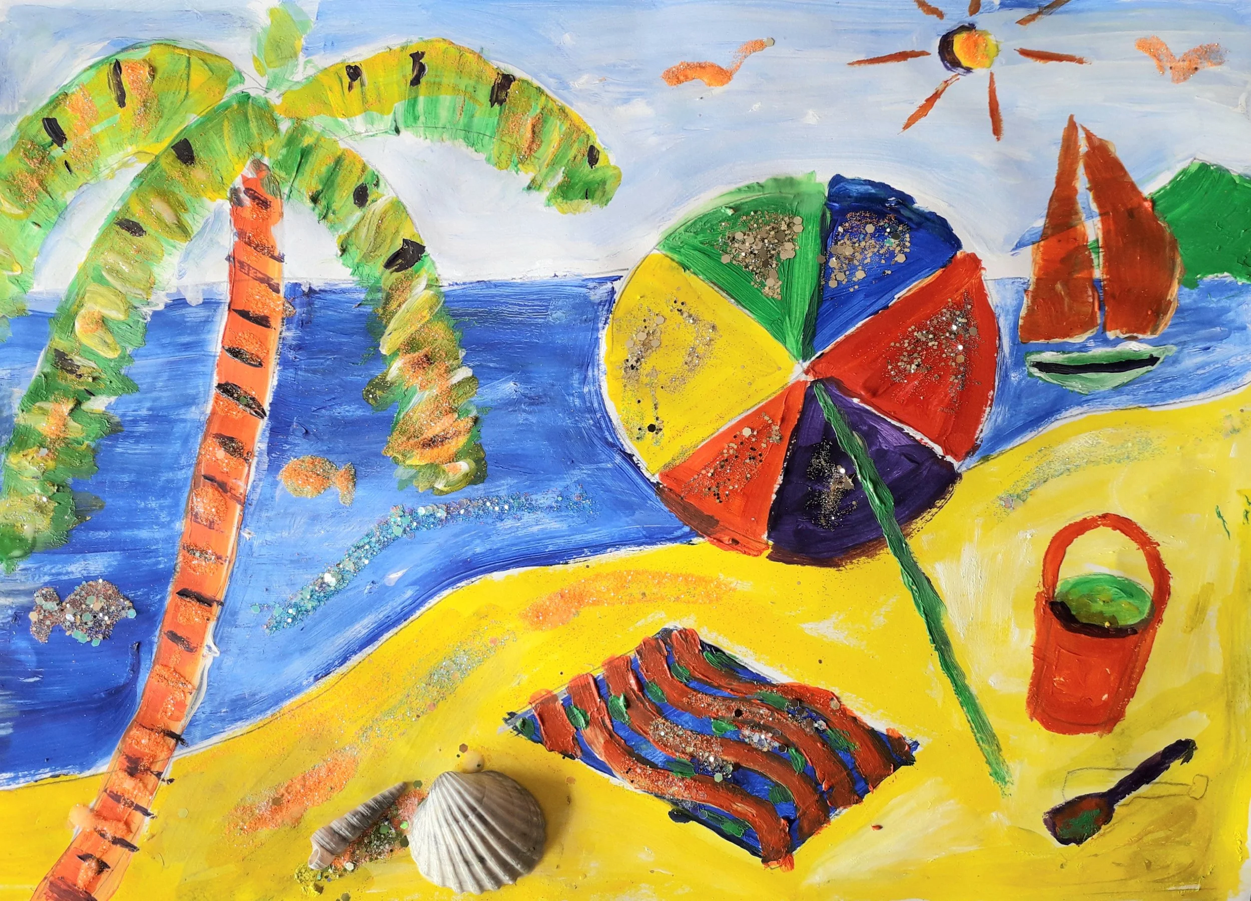 An imaginary beach scene, made with acrylic paint, sparkly glitter and shells.