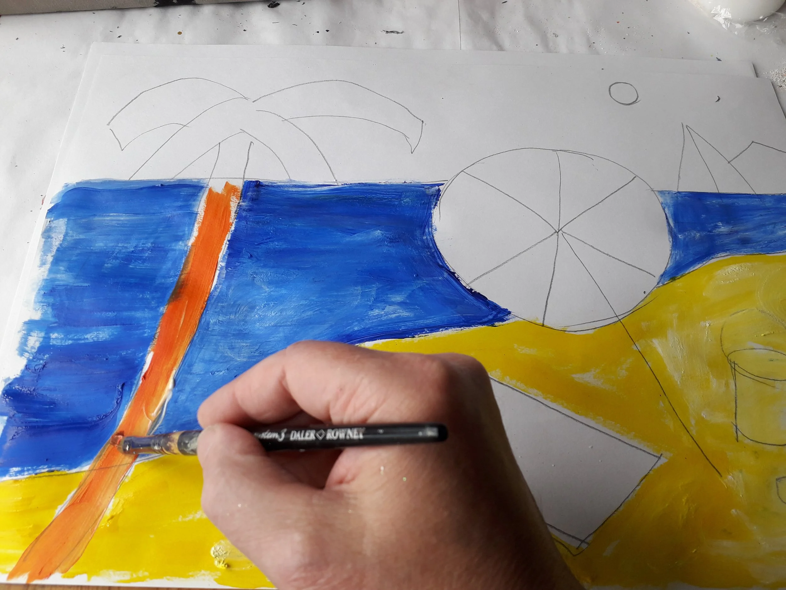 Begin painting the sand with yellow acrylic paint.