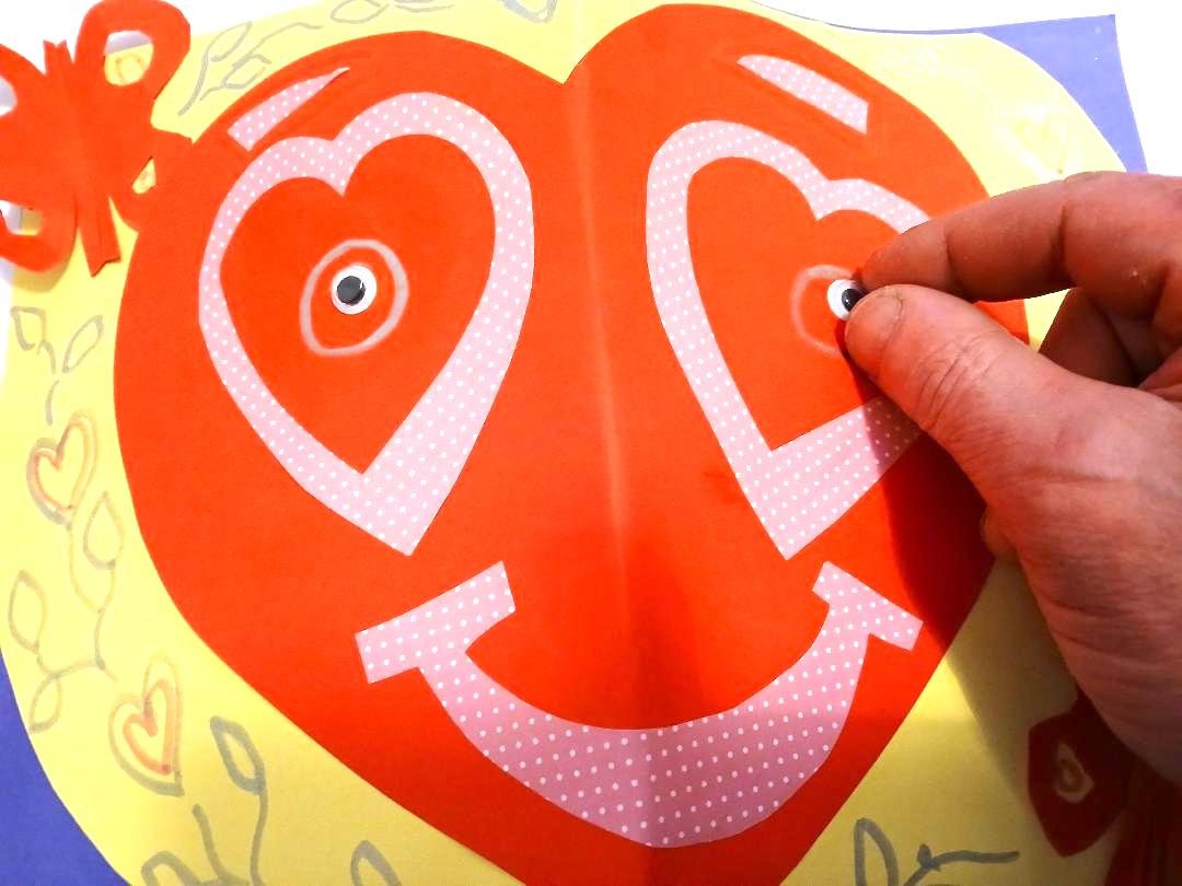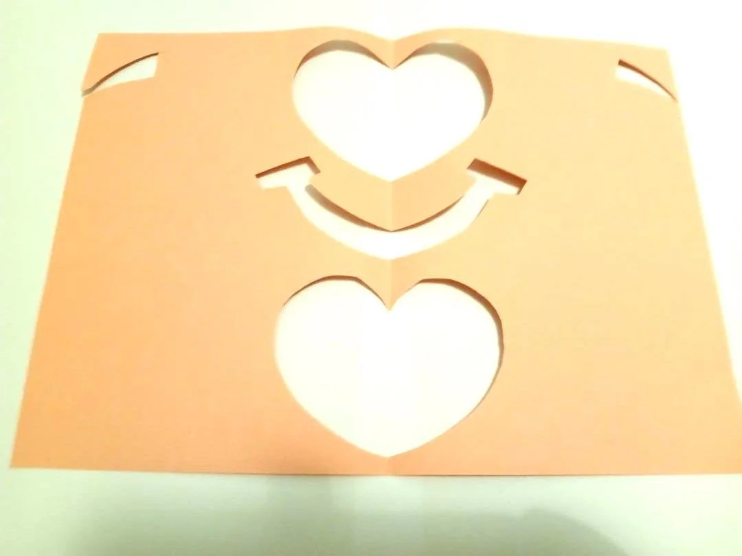 Take pink or similar colour card and cut 2 heart shapes and a smiley mouth and 2 eye browse shapes.