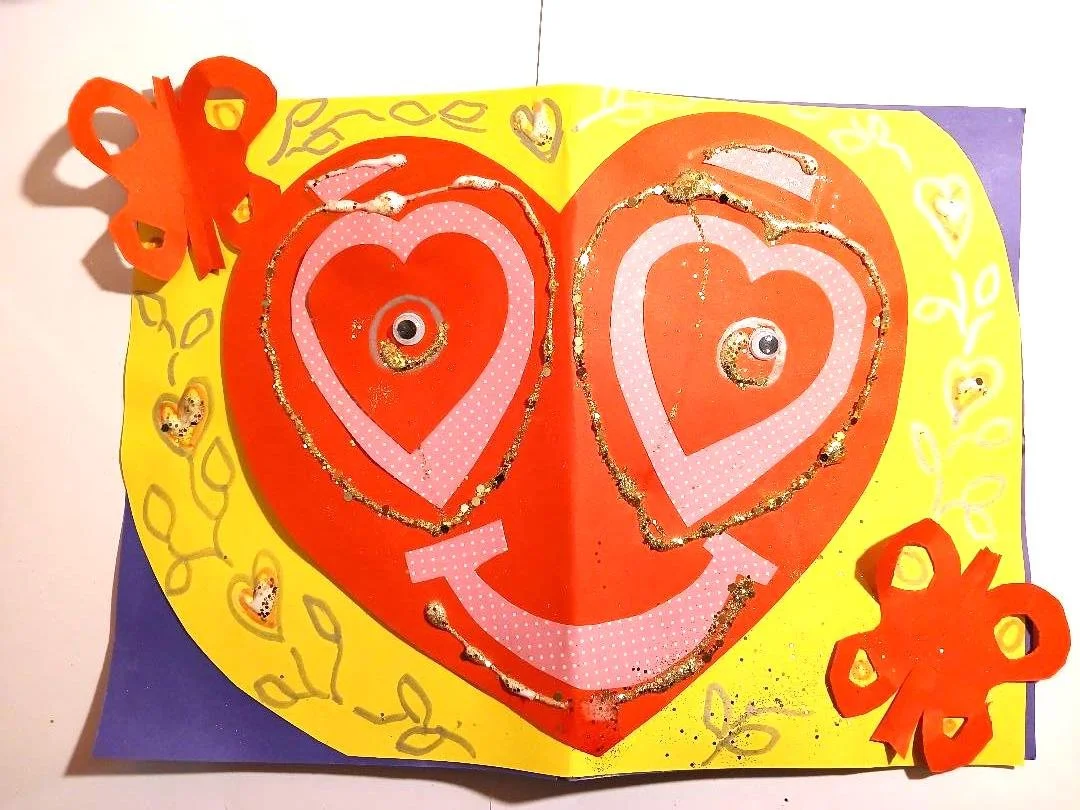 Made with colour card, sparkle pens, glitter and wobbly eyes.